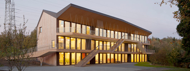 Located in a green belt of Lausanne’s western metropolitan area, the school building of Bois-Genoud integrates the Rudolf Steiner pavilion campus.