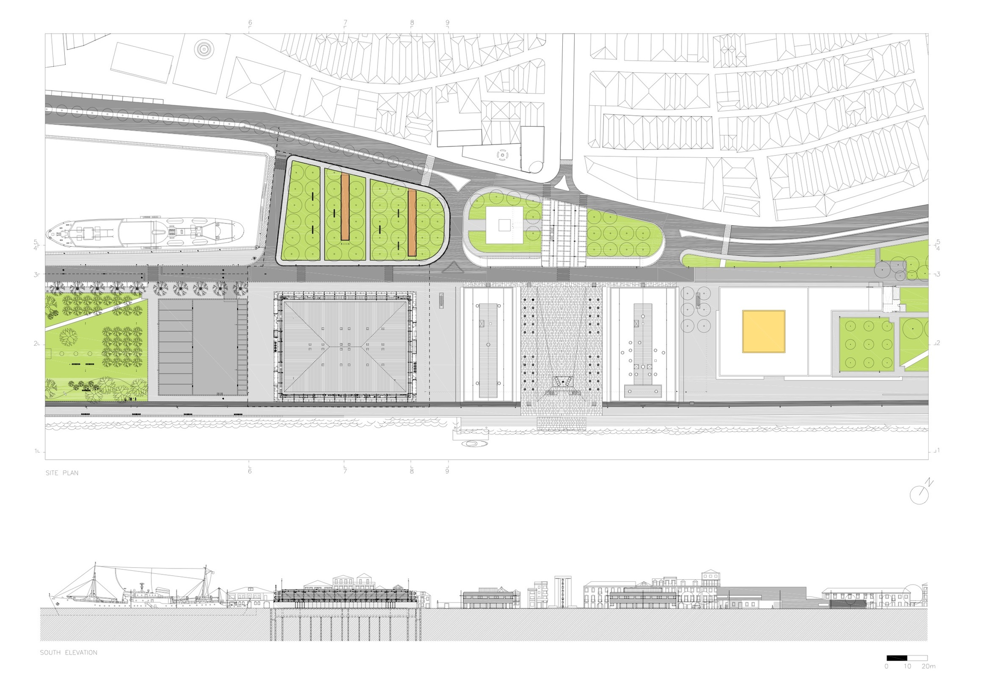 In front of the north elevation it is foreseen an arborised square with alleys that mark the entries of the Pavilion. In this square will exist a slope that will make the access to level -1.