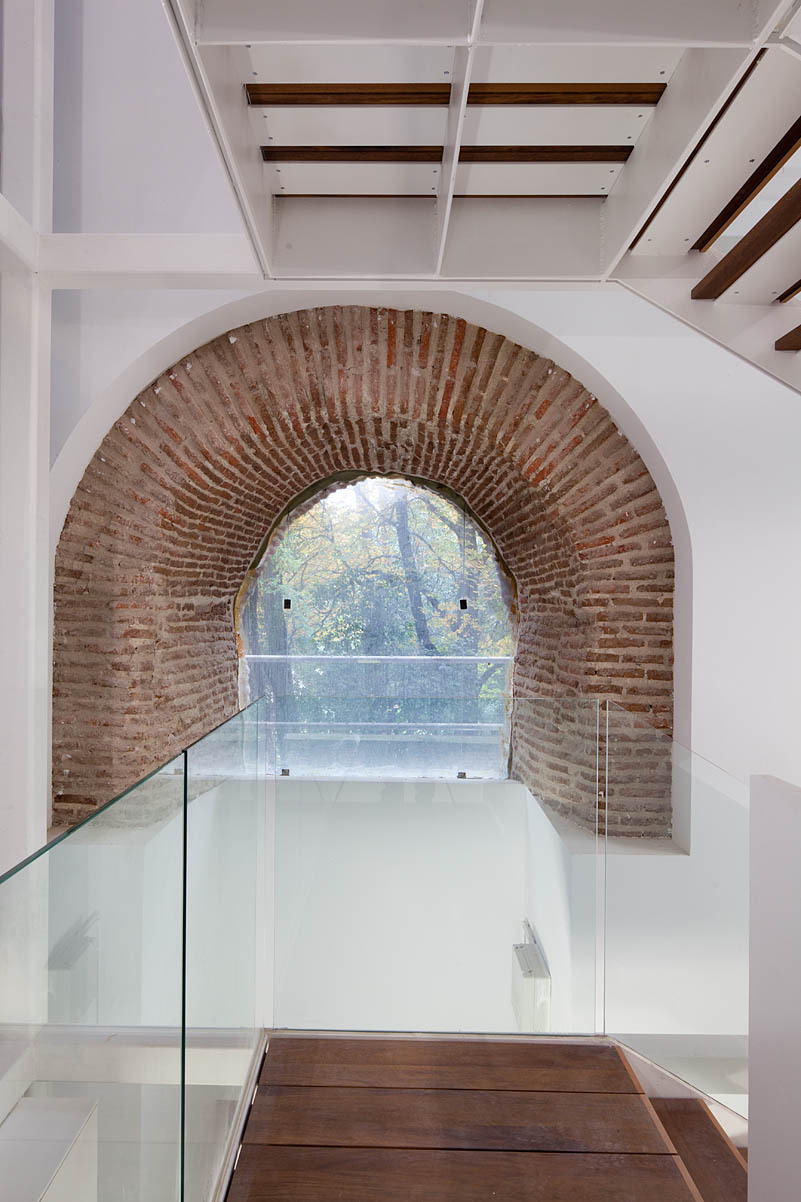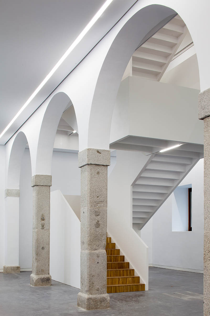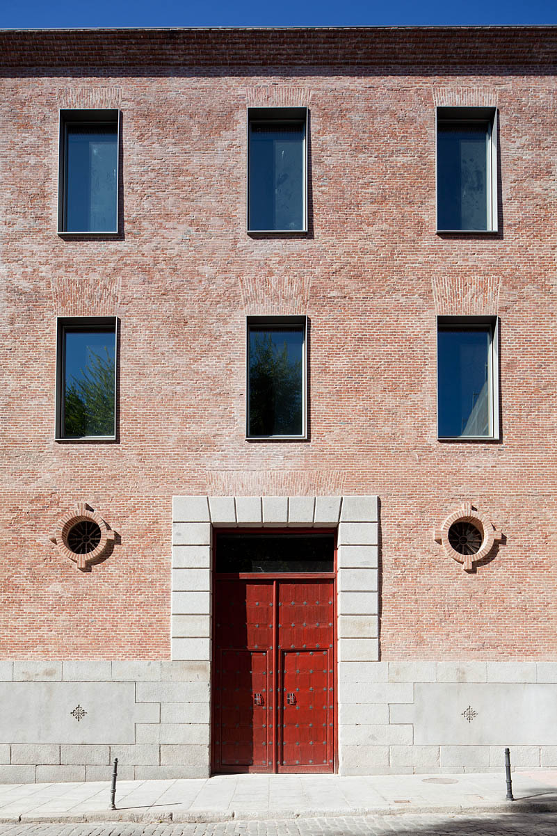 El lenguaje común unifica todo el edificio. Las fábricas originales, allí donde se encuentran, se recuperan y liberan de los revocos y pinturas superpuestas, proponiendo así un lienzo continuo y homogéneo. Las ampliaciones se cubren de blanco, y dejamos que los alzados nos expliquen su historia. Si los paramentos, incluidos dinteles y cornisas, componen la base de este discurso, será el hueco quien aporte los matices. Perfectamente ordenado, con ritmo repetitivo, recupera ahora la proporción vertical dupla, y se viste de una carpintería mixta, de acero y madera, que logra minimizar su presencia al exterior, sin dejar de ofrecer calidez al interior.