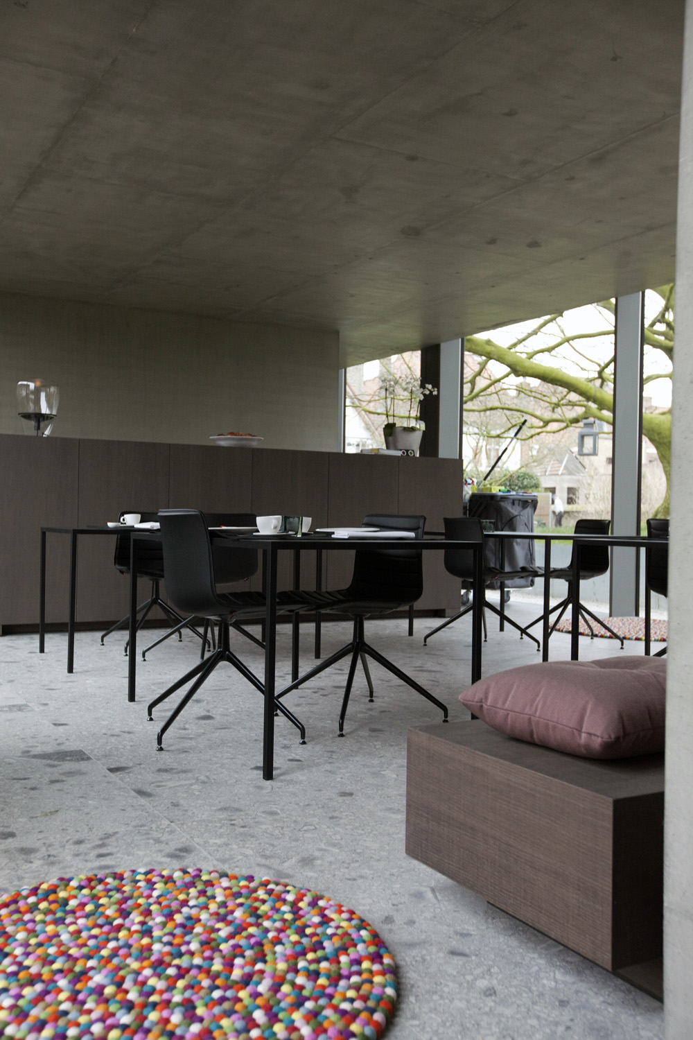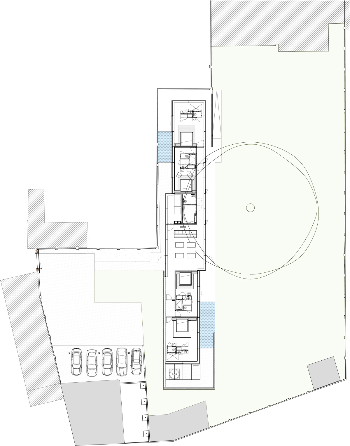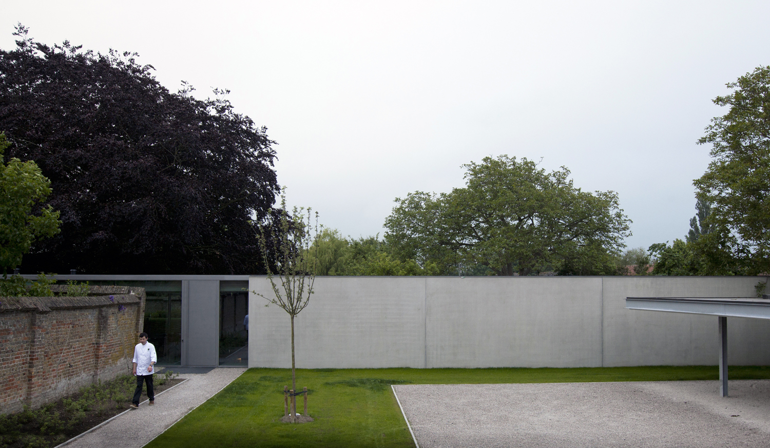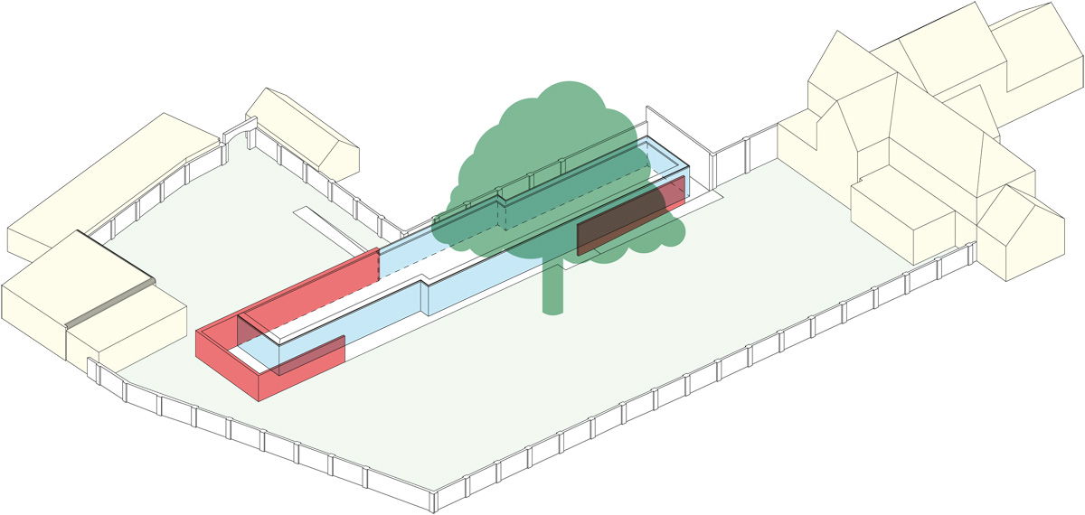 A 300 years old beech tree determines the atmosphere inside and outside throughout the season. Keeping and not harming this natural monument was vital to the design. Because of this, the building became linear, flanking the three. In order to apply a minimal impact on the surrounding, the whole building was placed 50cm beneath ground level.