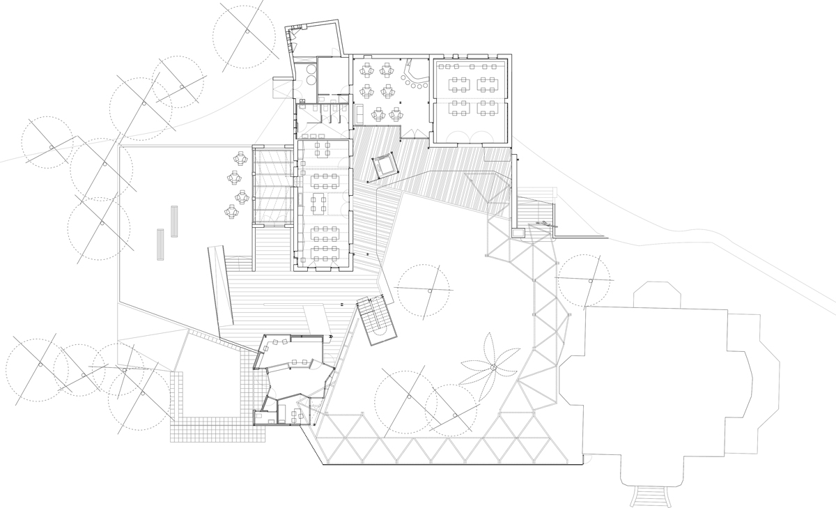 La propuesta establece una diferenciación clara entre lo que se mantiene y lo que se construye nuevo. De este modo, las fachadas y las cubiertas inclinadas a dos aguas de los edificios a mantener se rehabilitarán haciendo únicamente intervenciones mínimas.