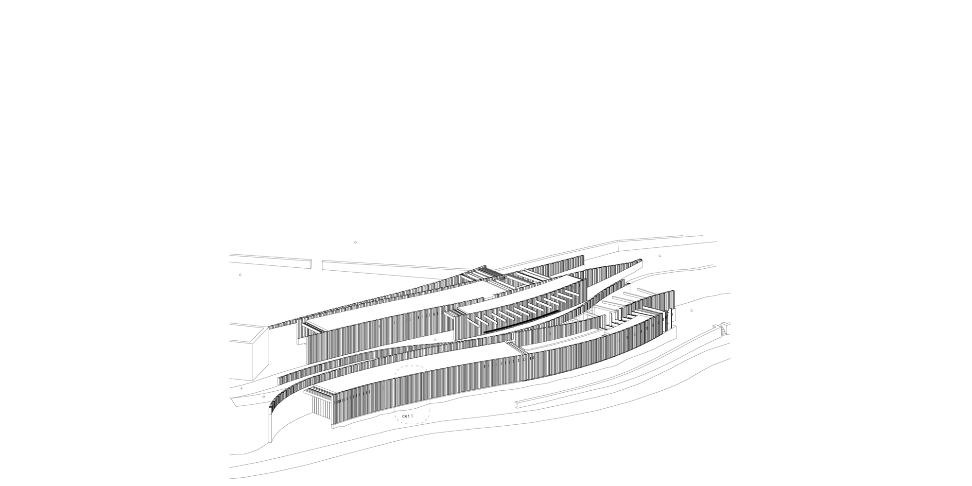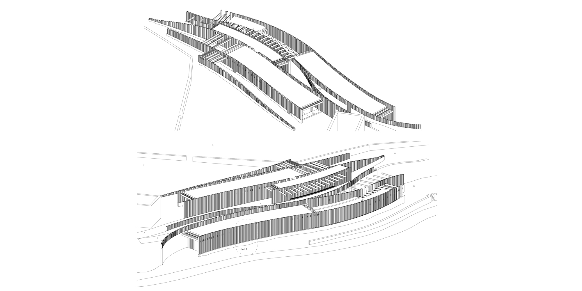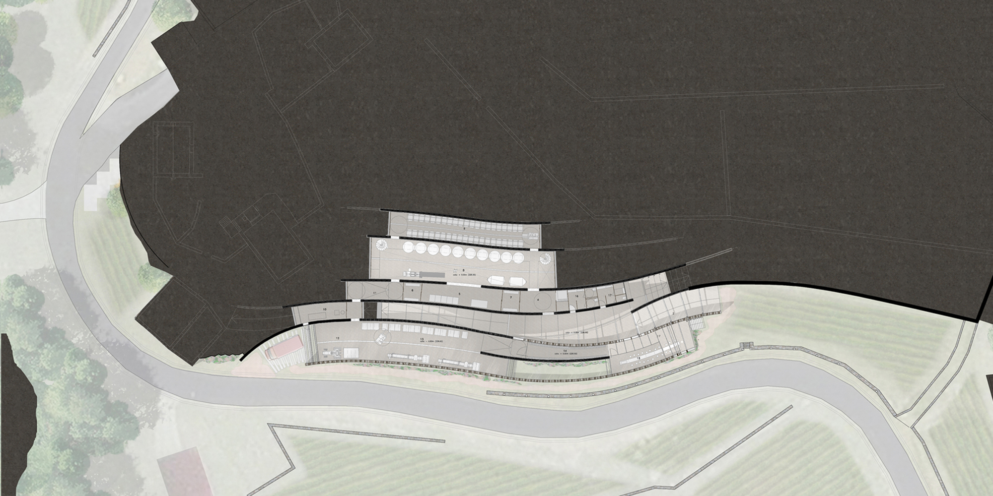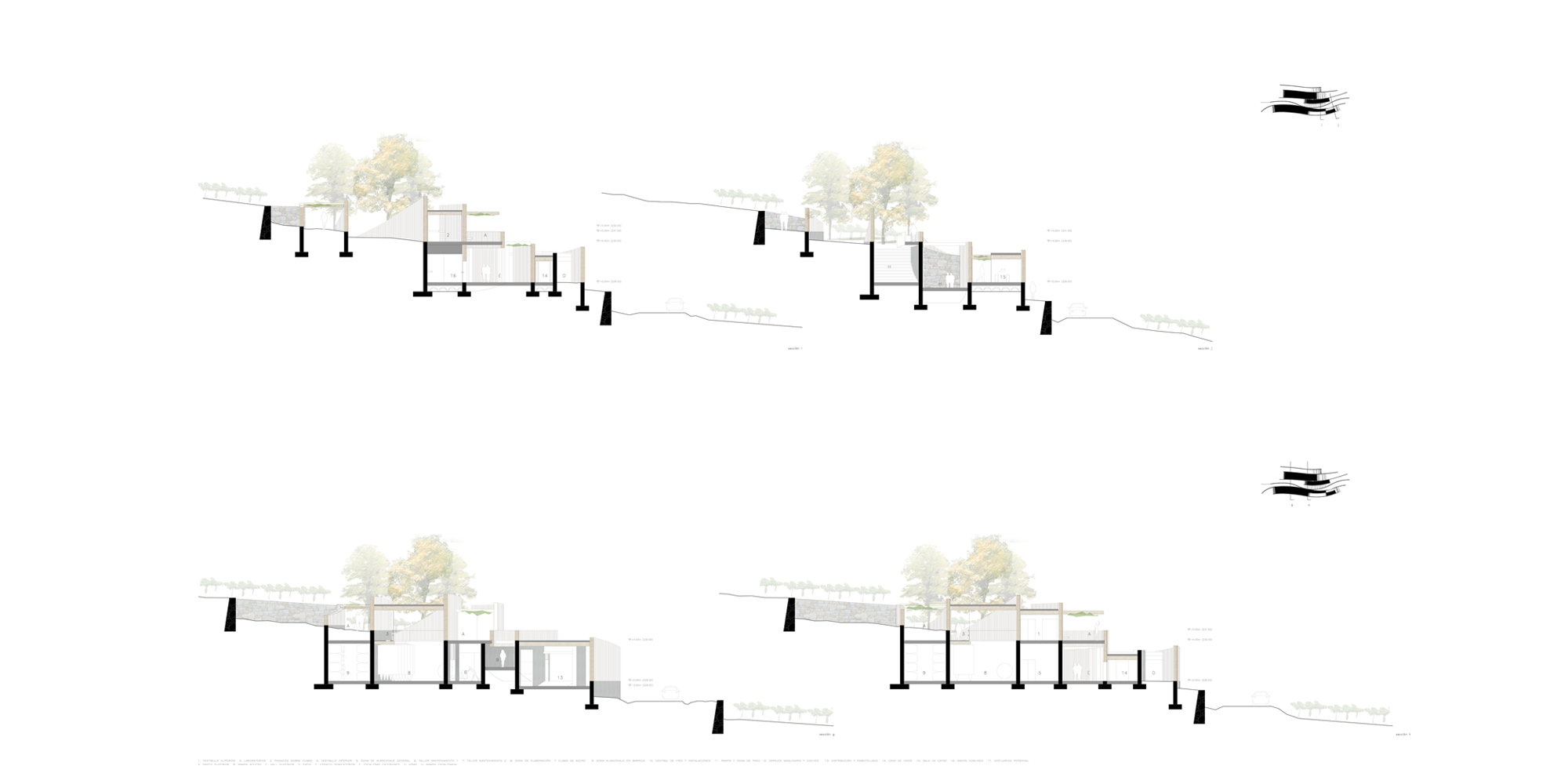 O Ribeiro es conocido por su produccion de vino y denominación de origen. Se trata de un paisaje con poca densidad de población pero muy construido. Sus valles con fuertes pendientes se han adaptado para la plantación y explotación de viñedos. Éstos vuelcan sus vistas hacia las fragas del río Avia. Todo está hecho con la calma y el saber hacer que conlleva las técnicas rudimentarias. La parcela se encuentra en lo alto de una colina. Con pendiente hacia el sur y unas vistas envidiables, se convierte en un mirador natural. La bordea por el sur y el oeste una carretera que serpentea sinuosamente entre bancales y une agrupaciones de casas y parroquias como Cabanelas. Por el norte es colindante con un pequeño grupo de casas y por el este lo delimita una fuerte pendiente, rematada en el sureste por el cementerio y la iglesia parroquial, ambos visibles desde la parcela. Esta tiene 5 niveles de bancales que crean diferentes espacios, terrazas, viñas, zonas de trabajo… es arquitectura sin arquitectos. La idea es la reinterpretación de los muros existentes. Variando el concepto de muro de contención y experimentando con la materialidad del mismo. La evolución es un muro de contención con una dualidad material. Cuando el muro deja de contener tierras, cambia su cualidad. Se convierte en un muro liviano, translúcido, que a la vez de separar espacios, los relaciona transversalmente.