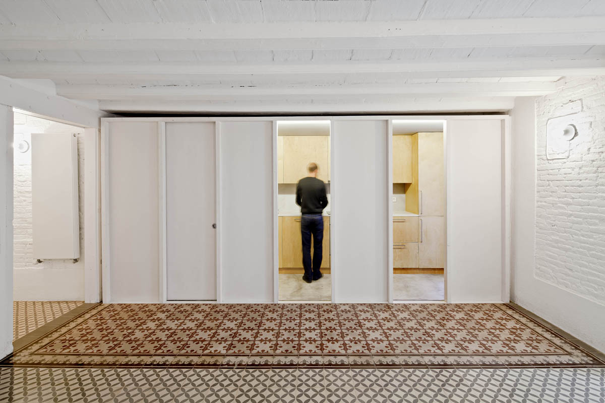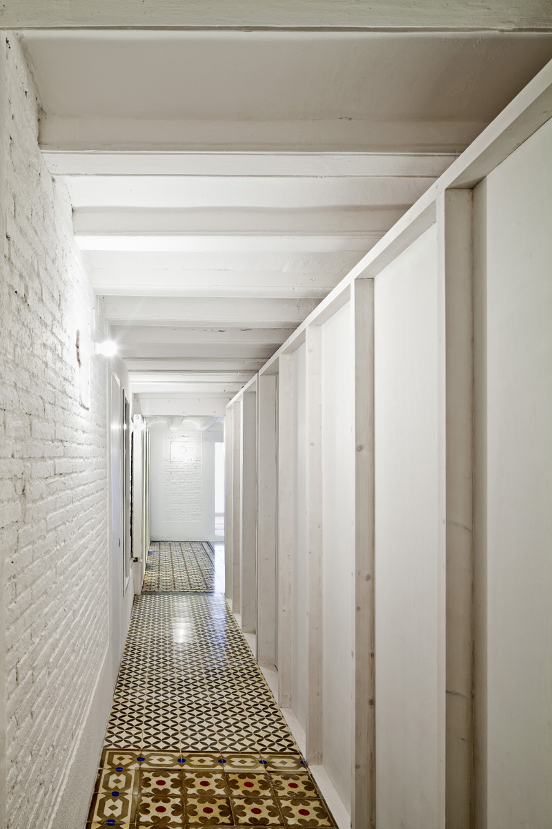 El apartamento era, cuando entramos, un conjunto de espacios en los que se apreciaban diferentes tiempos sobrepuestos. Usos diversos que habían acumulado elementos y capas sobre sus paredes a lo largo de los años, y habían acabado por conformar un ambiente extraño y desdibujado. A pesar de la confusión se podía apreciar la potencia de sus características definitorias originales: una estructura de espacios encadenados separados por una potente sucesión de muros de carga, el pavimento de mosaico hidráulico con distinción de jerarquía de usos, y techos ritmados conformados por bovedillas cerámicas y vigas de madera.