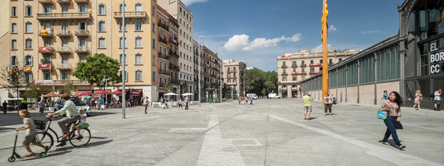 Se ha eliminado el tráfico de la calle Comerç en su tramo por delante del Mercat, desviándolo por el Passeig Picasso. De esta manera se configura un espacio de peatones en continuidad con el resto del barrio hasta los límites del Parc de la Ciutadella.