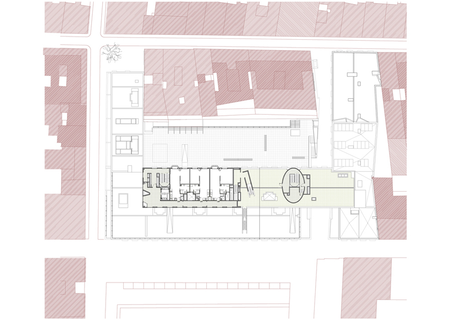 El nuevo edificio tiene más mérito si tenemos en cuenta que ha interpretado lo que le rodea, ya que ha convertido el volumen en un material sensible para los vecinos y algunas de las decisiones tomadas al respeto son la expresión de una intuición urbana remarcable. La formación de una esquina reculada donde se encuentran las calles Lleialtat y Carretes es otro. Otra de estas acomodaciones de volumen al espacio que ocupa es todo lo largo de la calle Lleialtat, donde el edificio que nos ocupa retira la fachada a partir del primer piso, dando lugar a una distancia más cómoda entre las ventanas de los vecinos de la calle, dejando entrar más luz y anticipando la visión de la plaza cuando avanzamos en esa dirección.