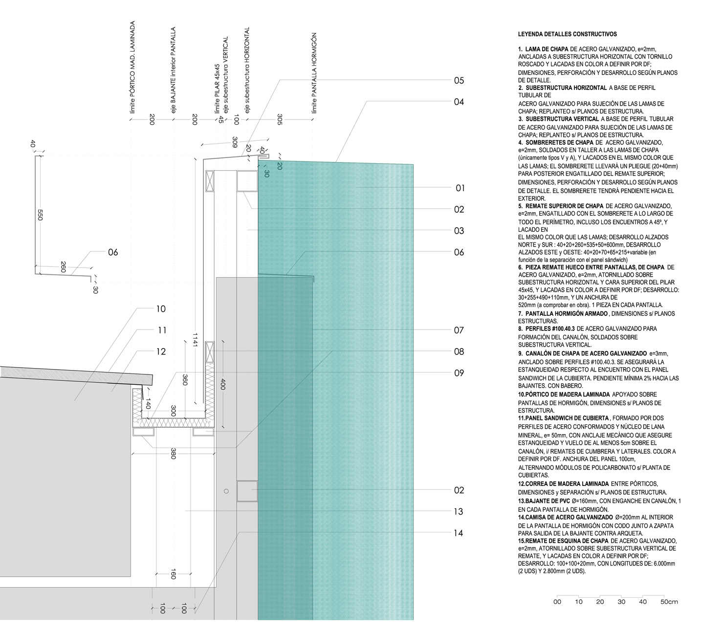 Esta piel metálica se hace realidad mediante lamas de chapa perforada de color azul de 3 tipos (A,V y L) que recuerdan a los elementos de un código de barras, donde una línea fina, una línea gruesa y un espacio amplio crean una alternancia no rítmica intercalando estos 3 elementos a lo largo de toda la fachada, y traduciendo así en su cara Sur y principal, el nombre del centro escolar.