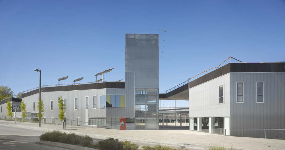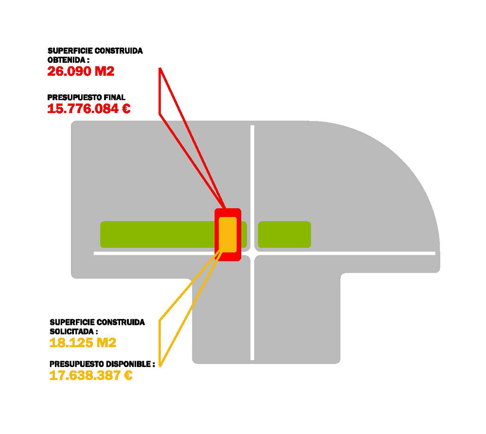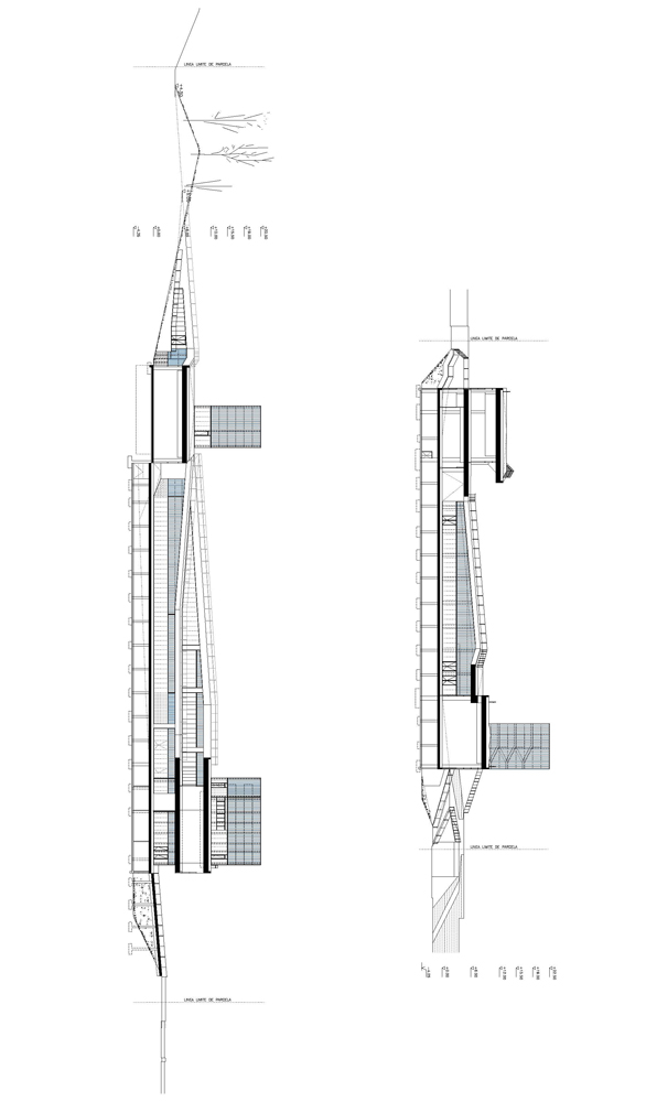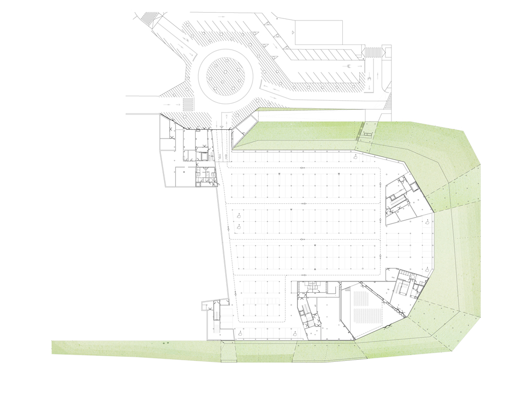 Sobre el nivel del terreno natural, por debajo de la rasante, se implanta el aparcamiento, reduciendo al máximo el volumen de excavación y facilitando además su ventilación natural a través de los taludes vegetados perimetrales existentes. Respetando estos “amortiguadores naturales” y sobre el nivel inferior, se construyen dos plataformas intermedias donde se produce la agrupación de programas y la variedad de accesos peatonales a nivel de las calles.