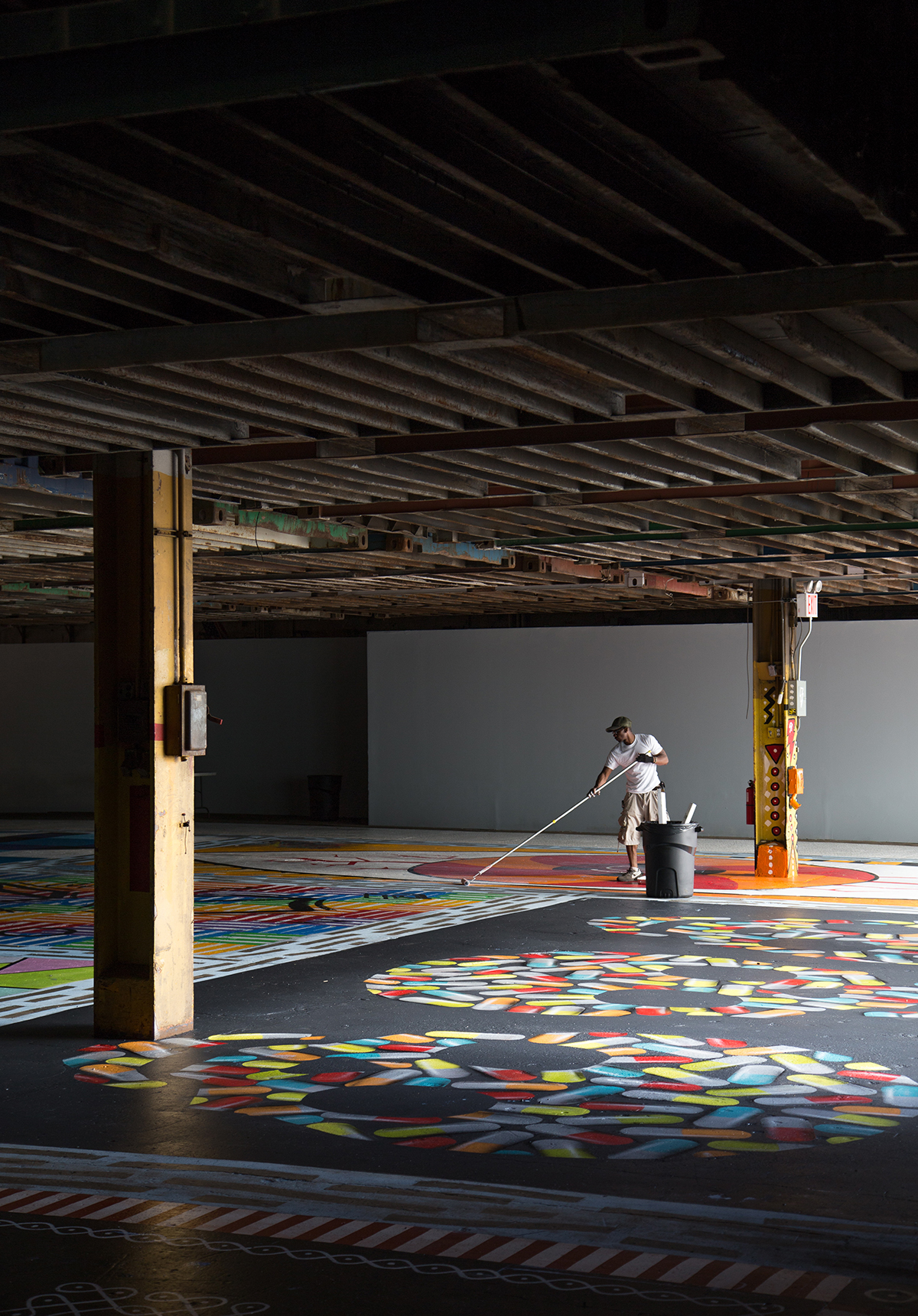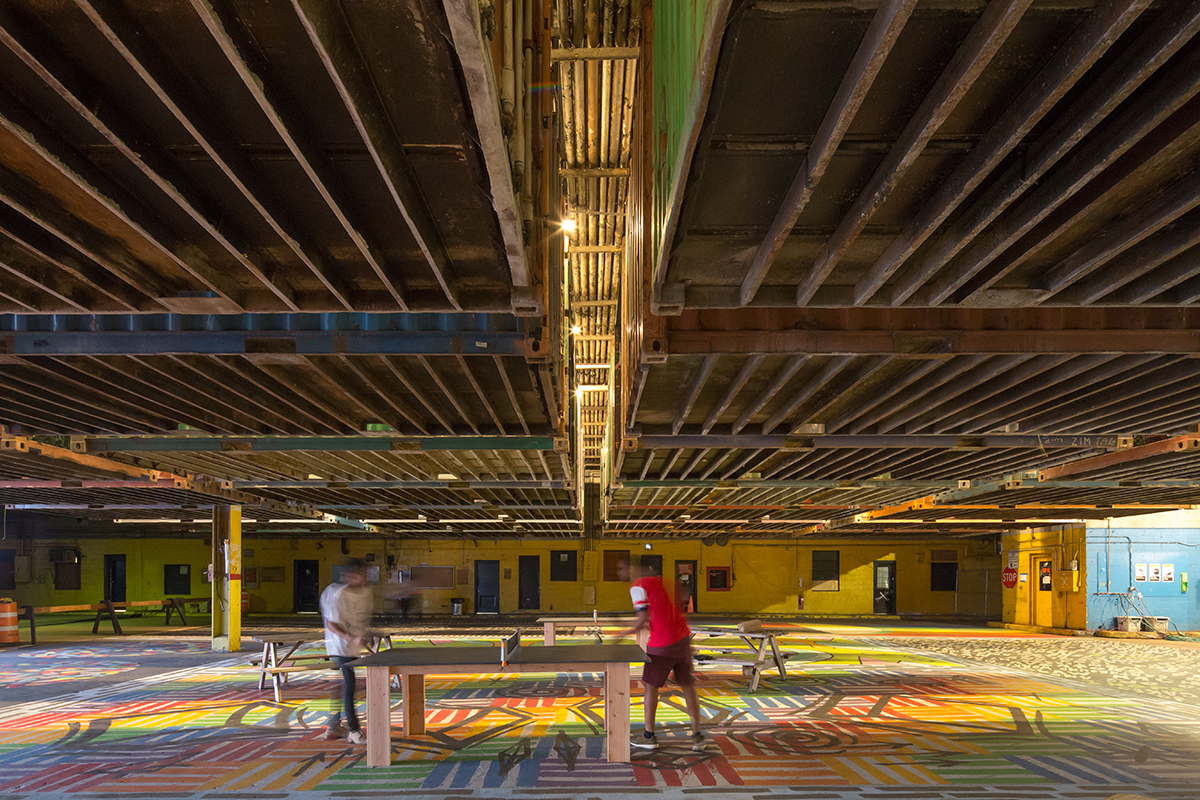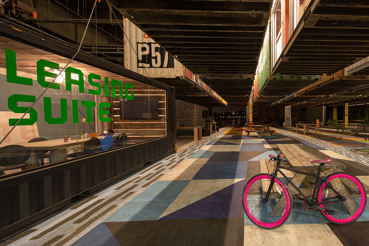 The “Magic Carpet” installation includes 36 shipping containers hanging 10 feet above the ground, and occupies the south end of Pier 57. For 18 months, until the Marina’s opening, it will float in suspension as it witnesses and participates in a variety of events and exhibitions. The containers can be adjusted accordingly, providing a flexible space for a range of activities. While people anticipate the completion of the marketplace, the installation reintroduces shipping containers to the area, and initiates the recovery of an abandoned space.