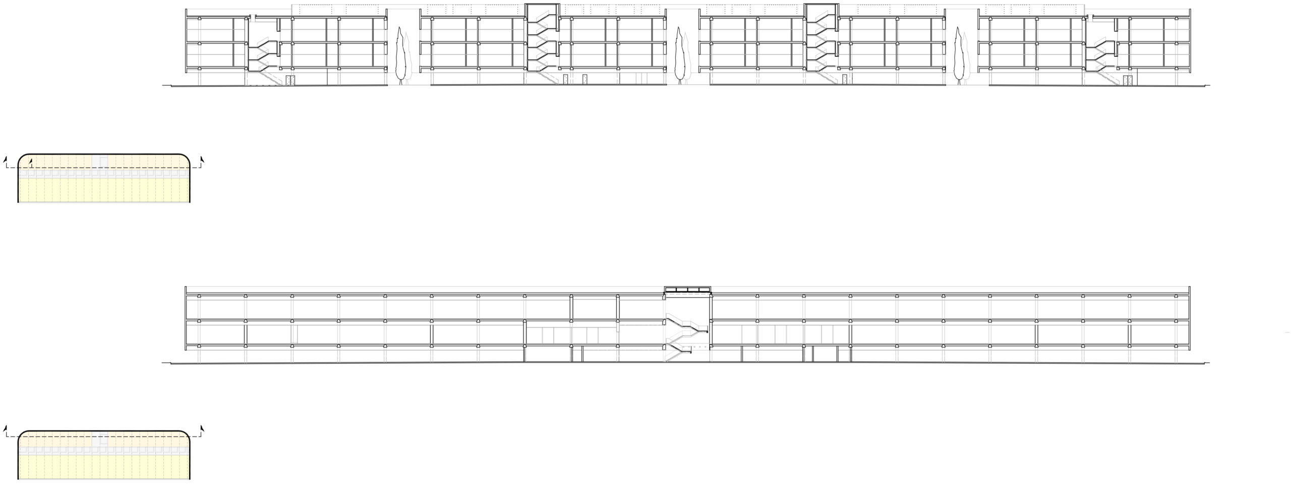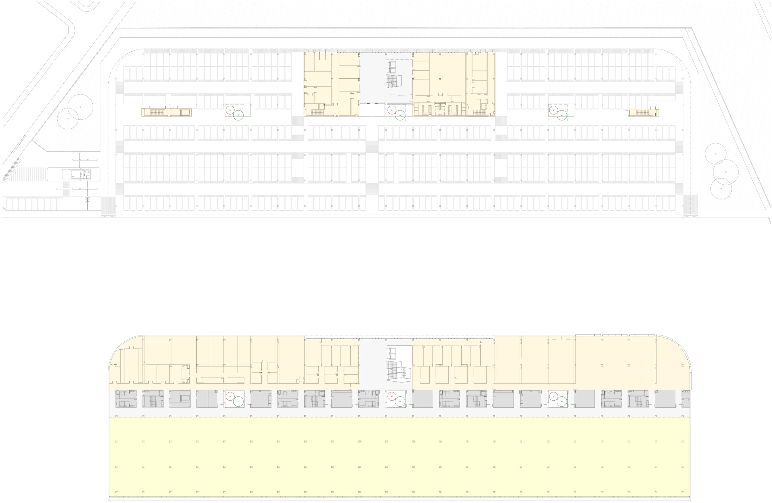 La solución tipológica de nuestro proyecto consiste en un edificio palafítico que libera la mayor parte de su planta baja para destinar dicho espacio al aparcamiento de vehículos. Cabe destacar la apuesta estratégica que significa implantar el aparcamiento en planta baja, que difiere de las soluciones tipológicas en suelo industrial (consistentes en implantar los aparcamientos en explanadas adyacentes a las edificaciones) o las soluciones más comunes en suelo urbano (consistentes en implantar el aparcamiento bajo rasante). La solución propuesta recoge las virtudes de la segunda, dando una accesibilidad óptima entre aparcamiento y edificio y protegiendo los vehículos de la intemperie y se acerca a la economía de medios de las soluciones en suelo industrial.
