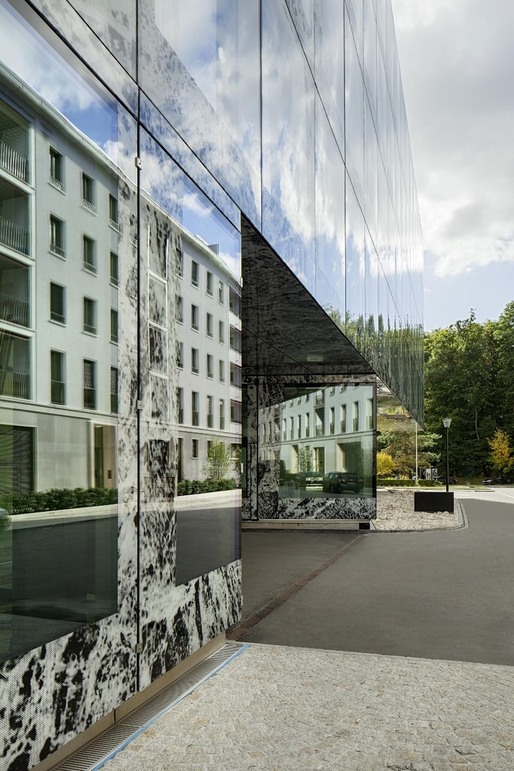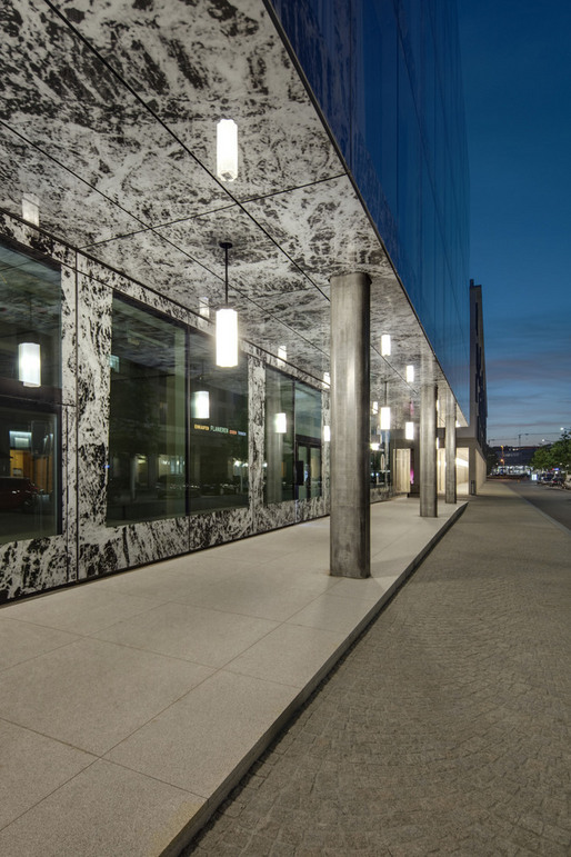 This new district’s master plan mandated that all building façades be composed of natural stone, yet it was chosen to frit this building’s full glass façade with an abstracted pattern of Onyx marble– from Mies van der Rohe’s Barcelona Pavilion–which allows the building to blend into its context while simultaneously maintaining its distinguished stance. Each element of the façade contains a closed cavity system, in which an aluminum coated silver curtain hangs, which fluctuates its degree of shading by responding to external environmental factors–a process administered by a computer controlled algorithm.