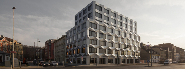 This office building stands at a kind of gateway situation at a prominent situation in Karlín, a district of Prague that is undergoing rapid change, at the corner of Pobřežni Street and Šaldova Street. The ground floor, taller than the other levels, contains shops and showrooms while the upper floors are occupied by office space. The external appearance of the building takes up geometrical themes found in Czech Cubism at the start of the 20th century.