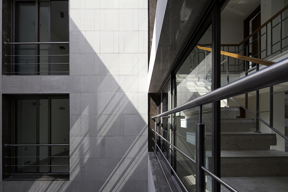 By employing a spare palette of materials – limestone floors, plastered masonry walls, and insulated glass – the interior spaces echo variations in the quality of light, and the colour of the surrounding foliage, the only urban links to topography and landscape, making the inhabitants aware of a sense of the elemental. For this project, we chose to adopt a selection of surfaces whose long-term benefits are considerable; hence our preference to build with singular materials expressed in their natural state such as the Gwalior sandstone façade or the limestone floors.
