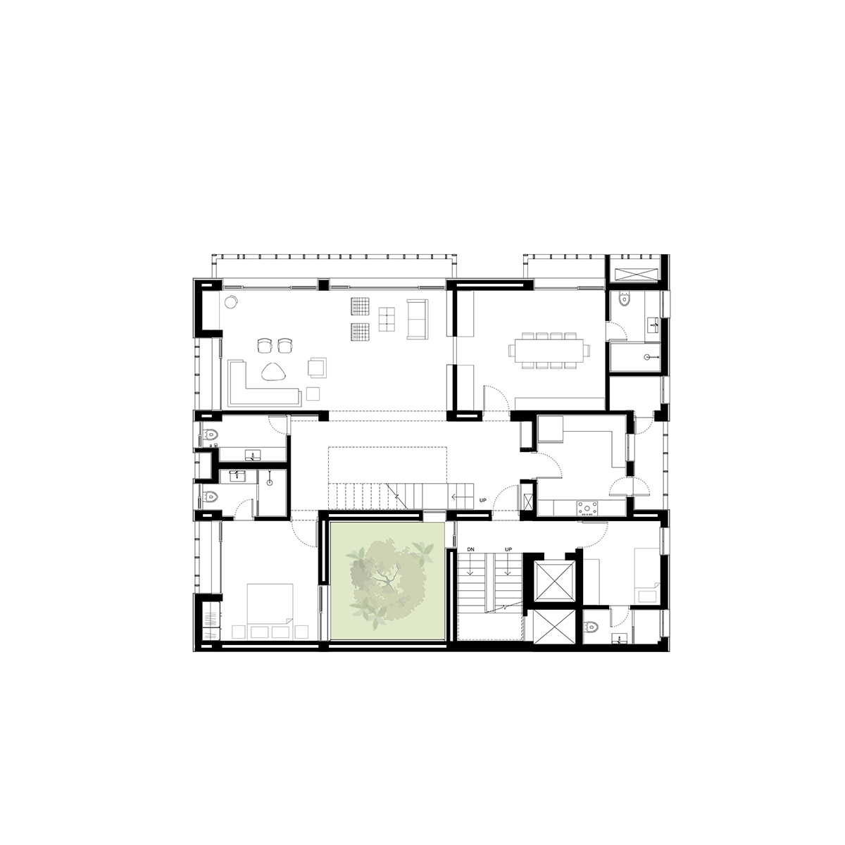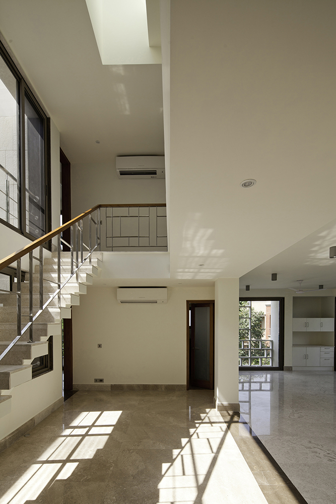 The Saxena apartments are designed to accommodate three families within two typologically distinct apartments – single floor and duplex. Our design chose to work within the fabric and scale of the context, anchoring this building firmly between a neighbourhood park on the north and a busy street on the west. Each apartment is envisioned as a container of sunlight, mapping the changing intensity of the sun on a highly reflective limestone floor. Rooms are organized around an interior “plaza”, eliminating circulation corridors and facilitating visual links between the rooms to the park and street outside. The choice of monolithic, sandblasted Gwalior sandstone panels for the facades enabled us to collaborate with the stone craftsmen, creating shade screens as thermal buffers on the street. By reducing the density of the stone on the north facing balconies, we imagined them as lanterns illuminating the public garden.