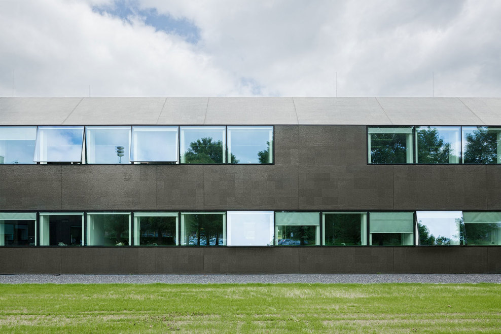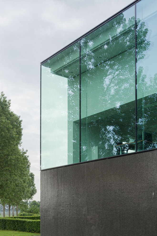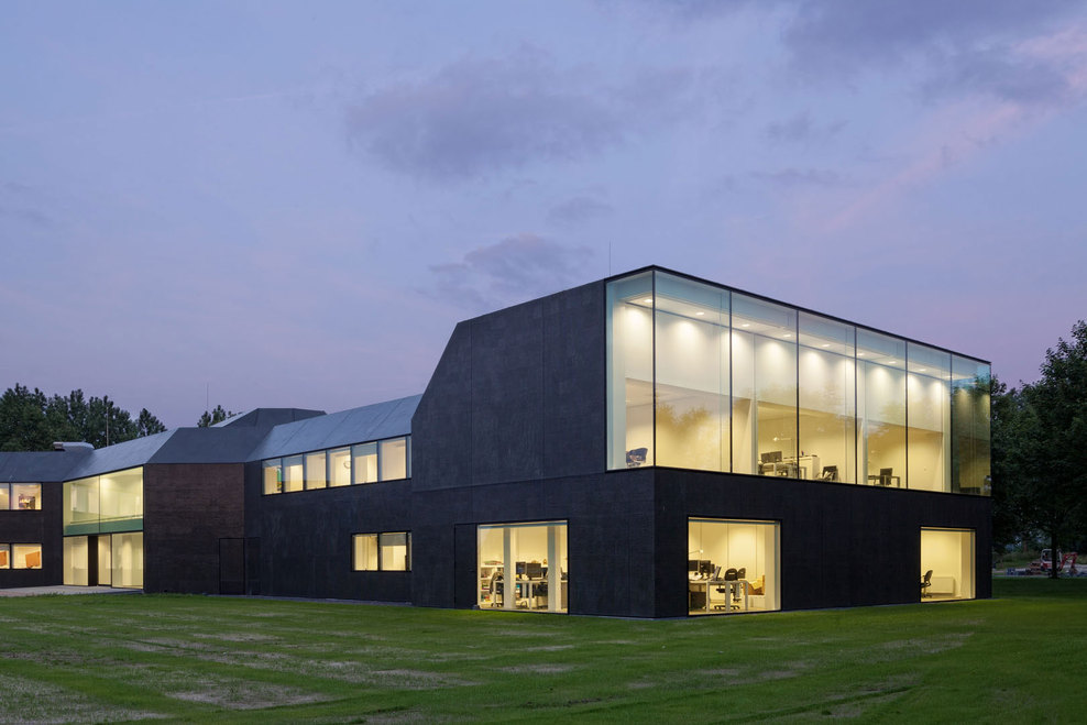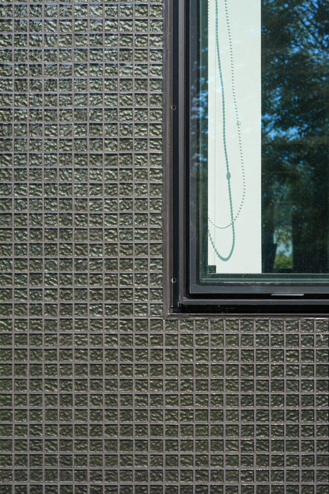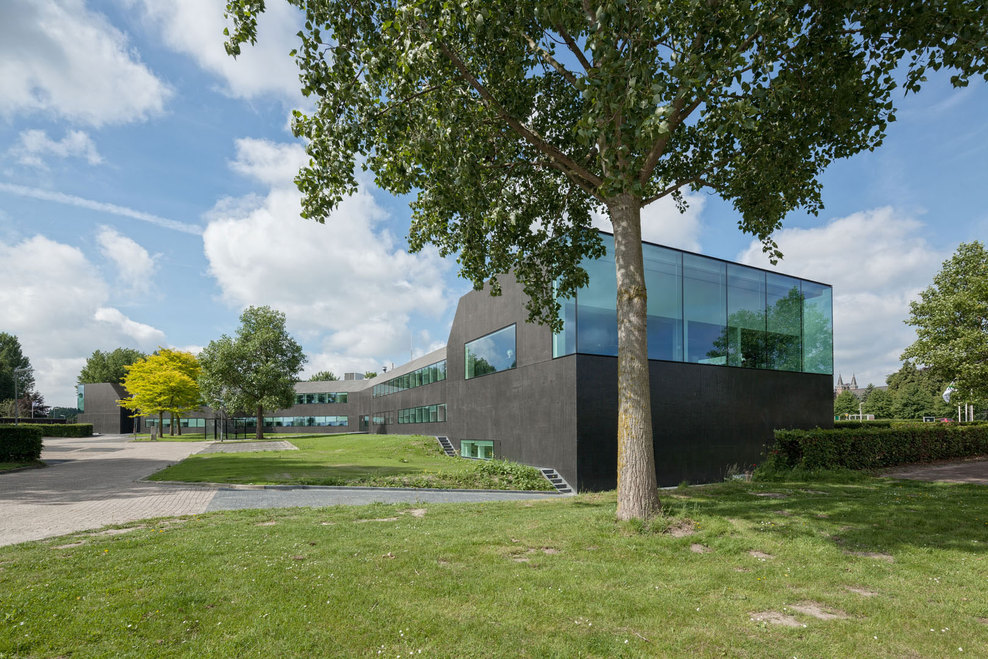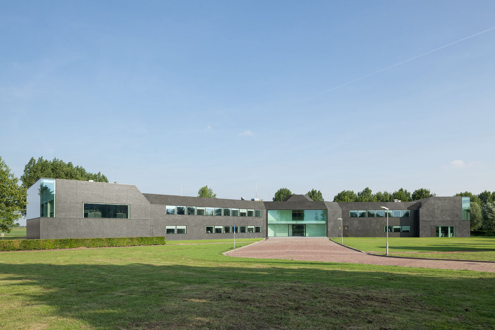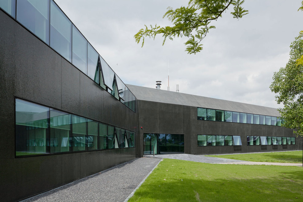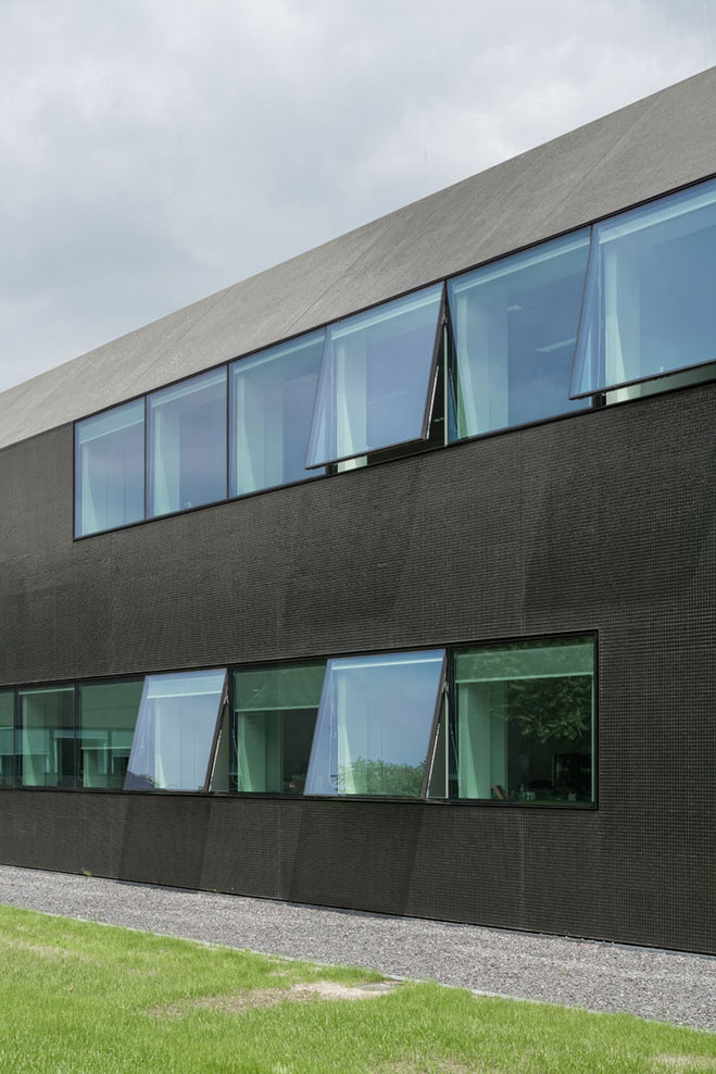 In a second step, the fragmented building shape was tamed and visually integrated by consequently wrapping the façade as well as the roof with one façade material. The new façade consists of glass mosaic tiles, which are glued on mounting plates and placed in front of a new insulation layer on the existing brick walls. The tiles were custom-made in China. Through the process of enameling rich light reflections are created. The black and green colour visually binds the building together and ads to the impression of compactness. At the same time, the colour refers to the tarred barns, which are typical in the Zeeland surrounding. The last step of the external renewal was to refine the proportions of the building. All exterior technical installations such as water pipes, ventilation grids and sun screens where removed. Several windows were adjusted. The window grid was enlarged to a format of 1,8m x 1,6m per window. The frames are filigree “pivoting frames” with solar glass filling. High performing textile screens were installed on the inside to provide additional sun protection.
