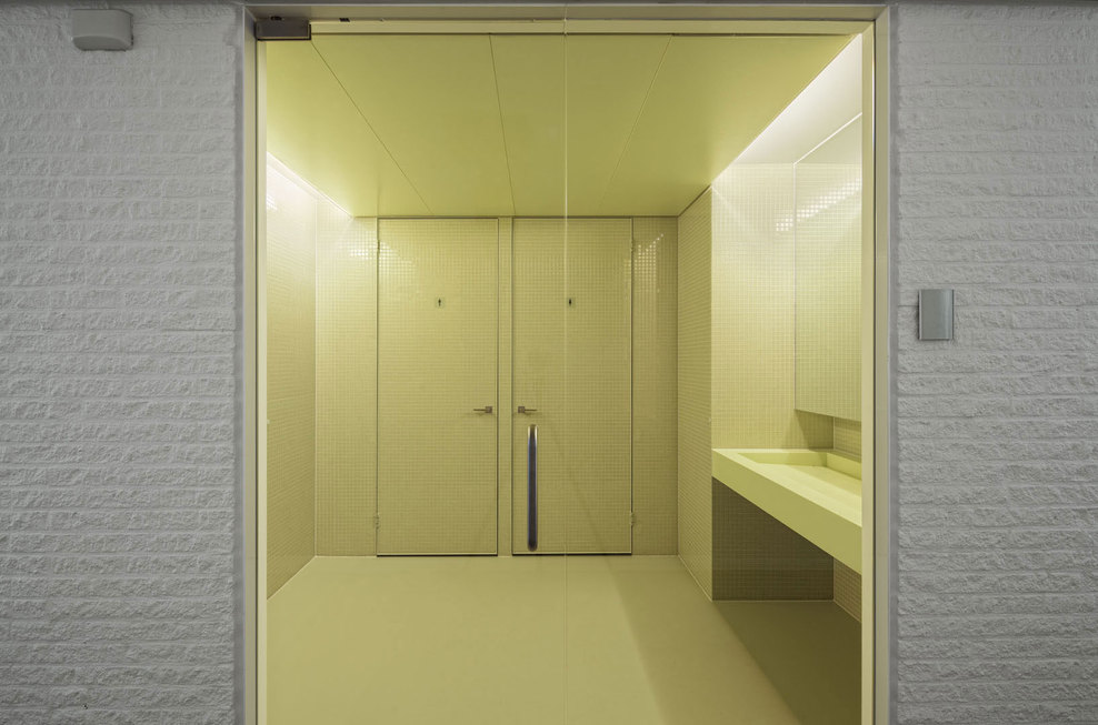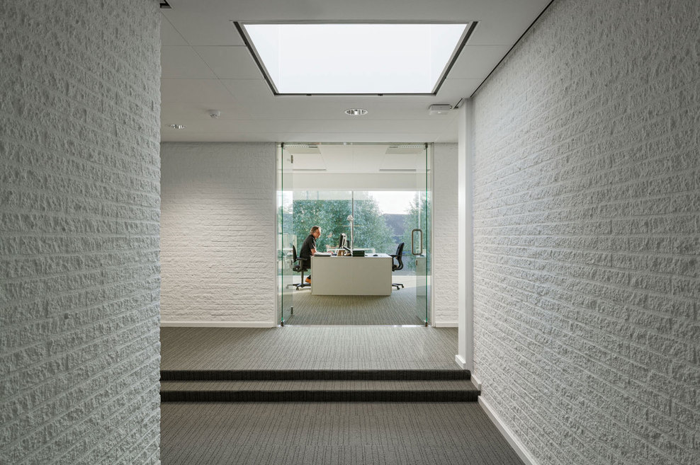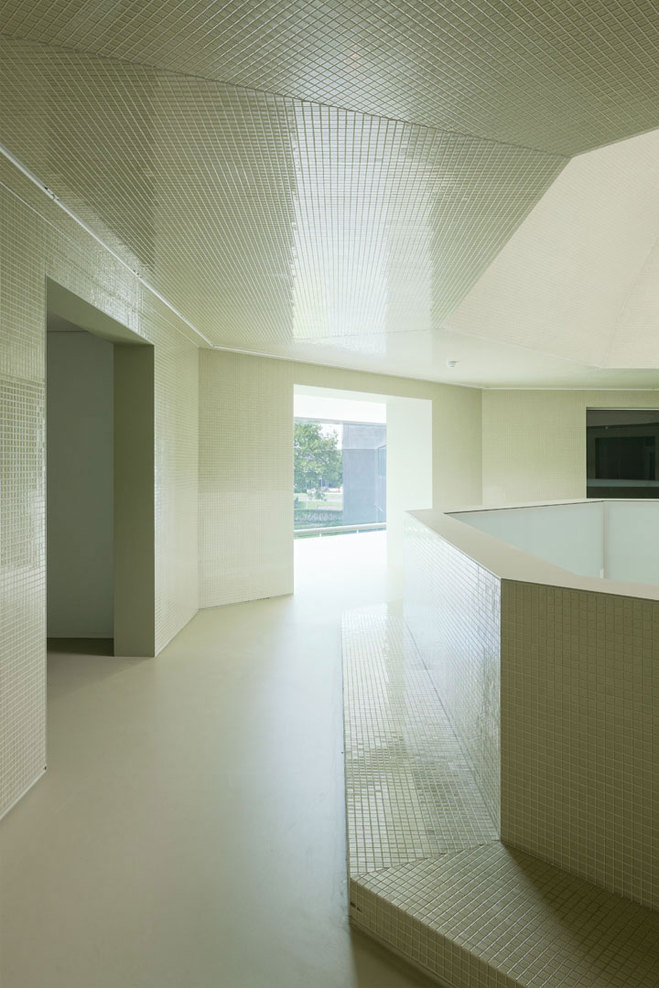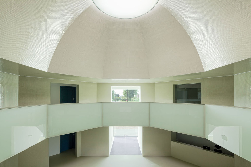 Regarding the interior, several steps were taken to improve the atmosphere and working conditions of the town hall. In particular, the two- floor high entrance hall turned out to be challenging. Since the existing geometry was unclear and the client wanted a more modern appearance, the architects decided to fundamentally reorganize the hall. The entrance hall was strategically downsized and organized in an octagonal shape, which was the result of the existing octagon-shape floor opening in the first floor. Within this new structure, it was also possible to create new meeting rooms and a separable reception area around the hall. The new ceiling was developed as a dome, again as a result of the existing octagon. In order to create a fluent experience between interior and exterior, the entrance hall was as well materialized from glass mosaic tiles, this time in a light – reflecting mint-green colour. The hall is illuminated by a circular skylight. The glass balustrades on the first floor are luminaires, which additionally spread light throughout the hall. Generous office landscapes were situated at the three heads of the building. Here, the fully glazed façades offer a panoramic view towards the green surrounding and the landscape of Zeeland.