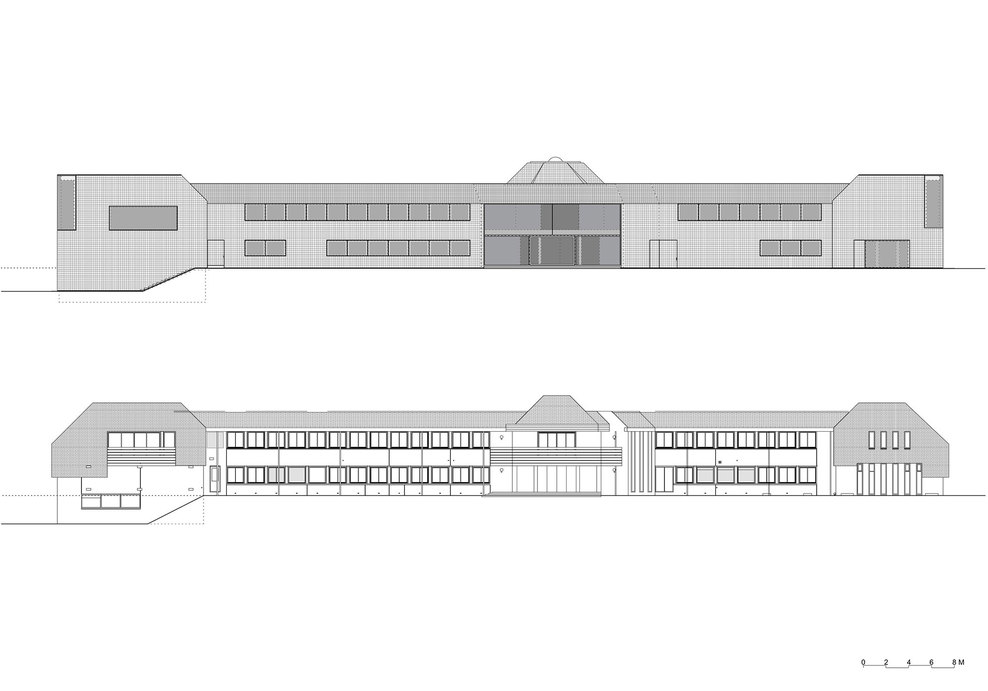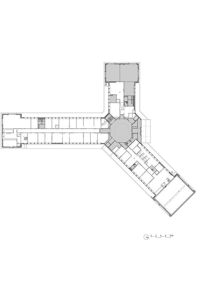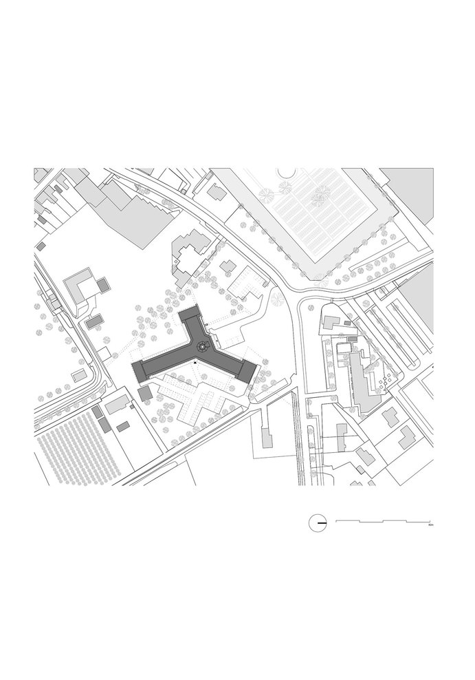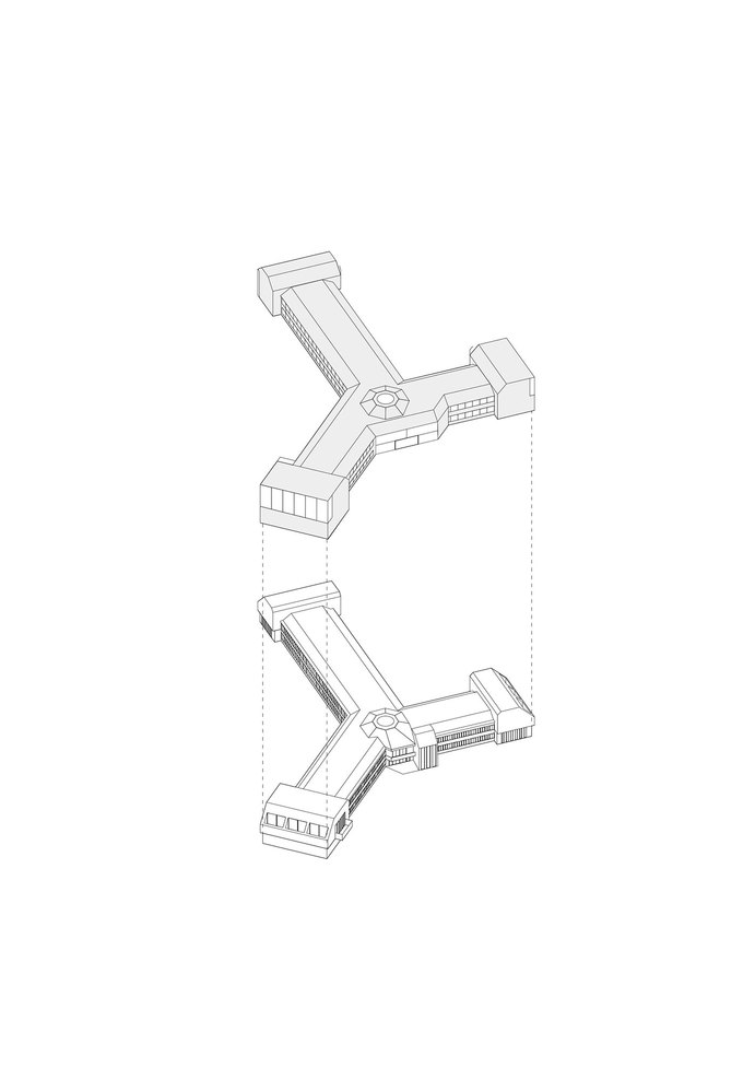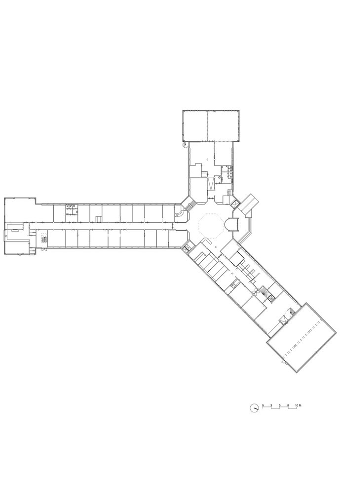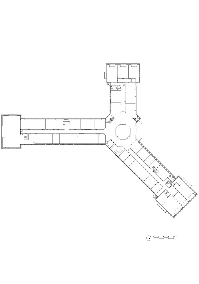 In a first step, the architects decided to adjust the three “heads” and the entrance hall of the star-shaped building, in order to partly clarify the existing geometry and to strengthen the building’s position within the context of the village. The façades of the heads where removed to a great extend and generous structurally glued glass facades were added. By that, the interior of the building became visible and a relation with the exterior was created. Furthermore, the entrance hall was slightly extended towards the outside, in order to enhance the visibility from the main road.