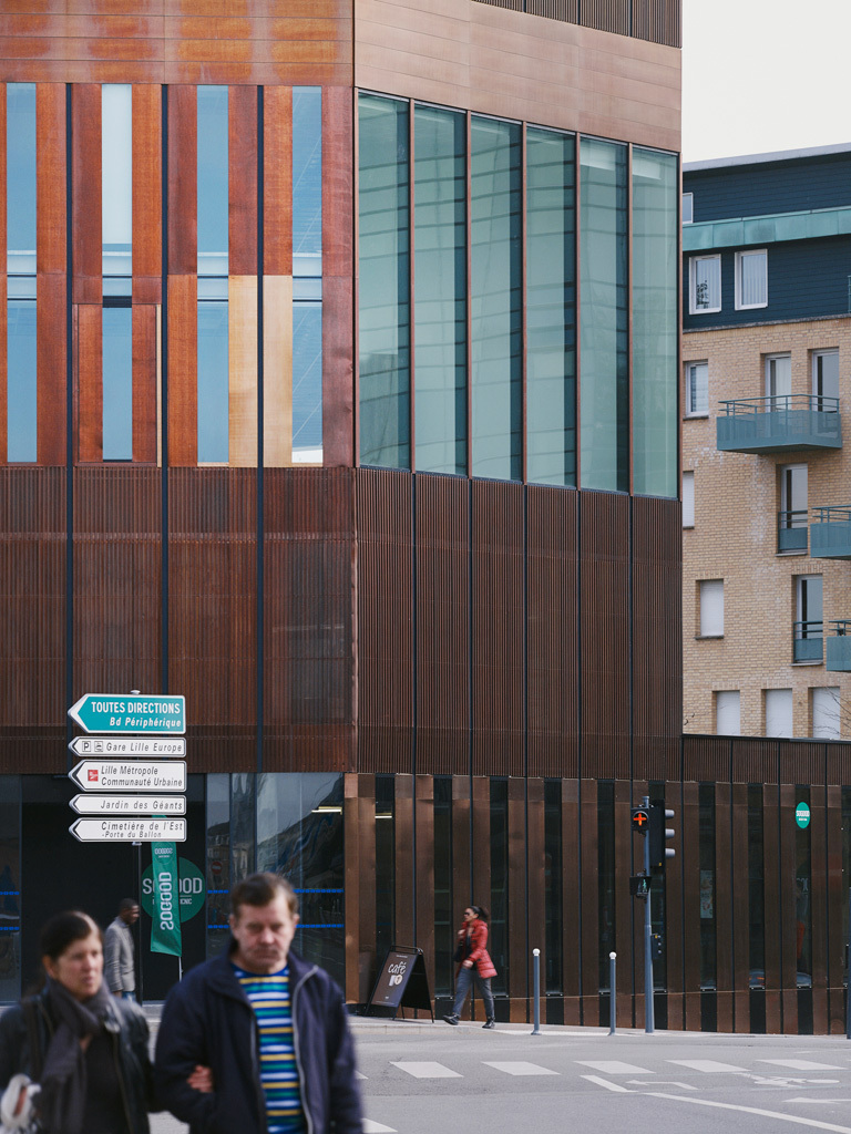 In order to complete this process of interrelation, the facades were designed to become a series of windows that provide a 360-degree panorama of the city, framing views of the city’s newer parts, its green spaces, and the downtown. The façades are characterized by different designs in response to their orientation, their usage, and their thermal requirements. The copper is used as a kind of fixed siding along the opaque or semi-glassed stretches of the façade.