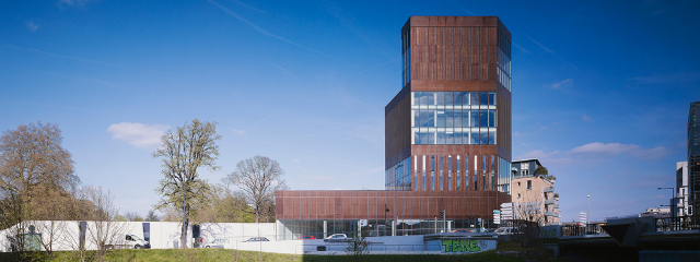 By extending and crossing the axes within the parcel, the initial extrusion was carved to obtain a kind of small tower. By completing the Avenue Le Corbusier, this vertical element is also a corner building on the Place Valladolid and it signals the city to drivers coming up from the beltway below. This architecture has created a new urban space that combines private and public, vertical and horizontal.
