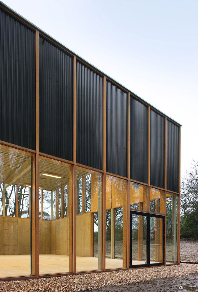 The surrounding forest is the starting point for URA to design a simple building which contains all confrontations of the site : open vs. closed, trees vs. slope, materiality vs. transparency, building vs. environment. The gymnasium is dug into the natural slope. The facade shows the duality of the context : a strong, closed concrete wall on the one side and a wooden structure with a black steel plates cladded facade on the other side. These two facades meet in the perspective of the stage-stair. The surrounding trees are seen from different perspectives. “Going to the gym” confronts the pupils (again) with the basic elements of nature.