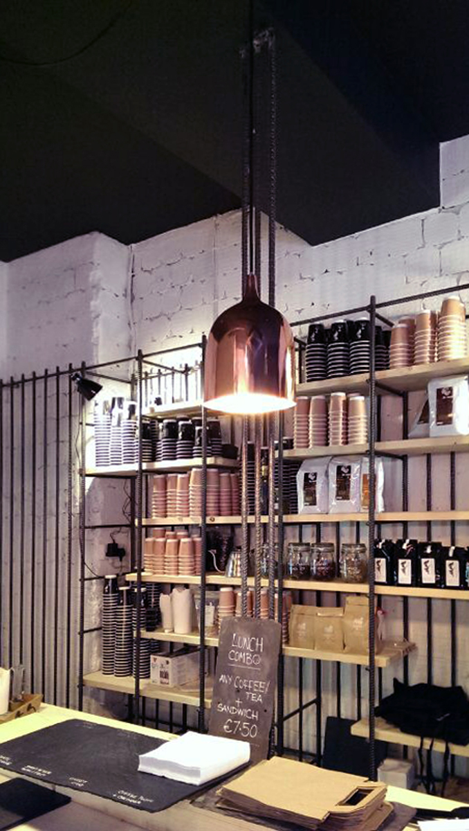 El coffee shop está situado en Main Street, Blackrock Village, Dublin. Dentro de un presupuesto ajustado, nuestro objetivo era encajar las diferentes funciones relacionadas con el café, en un espacio mínimo predeterminado y con limitaciones constructivas. El concepto del diseño trata de explorar y cuestionar la materialidad, experimentar con las cualidades de los materiales y técnicas del día a día, y al mismo tiempo crear algo único y totalmente característico. El material elegido fueron las barras de acero corrugado.