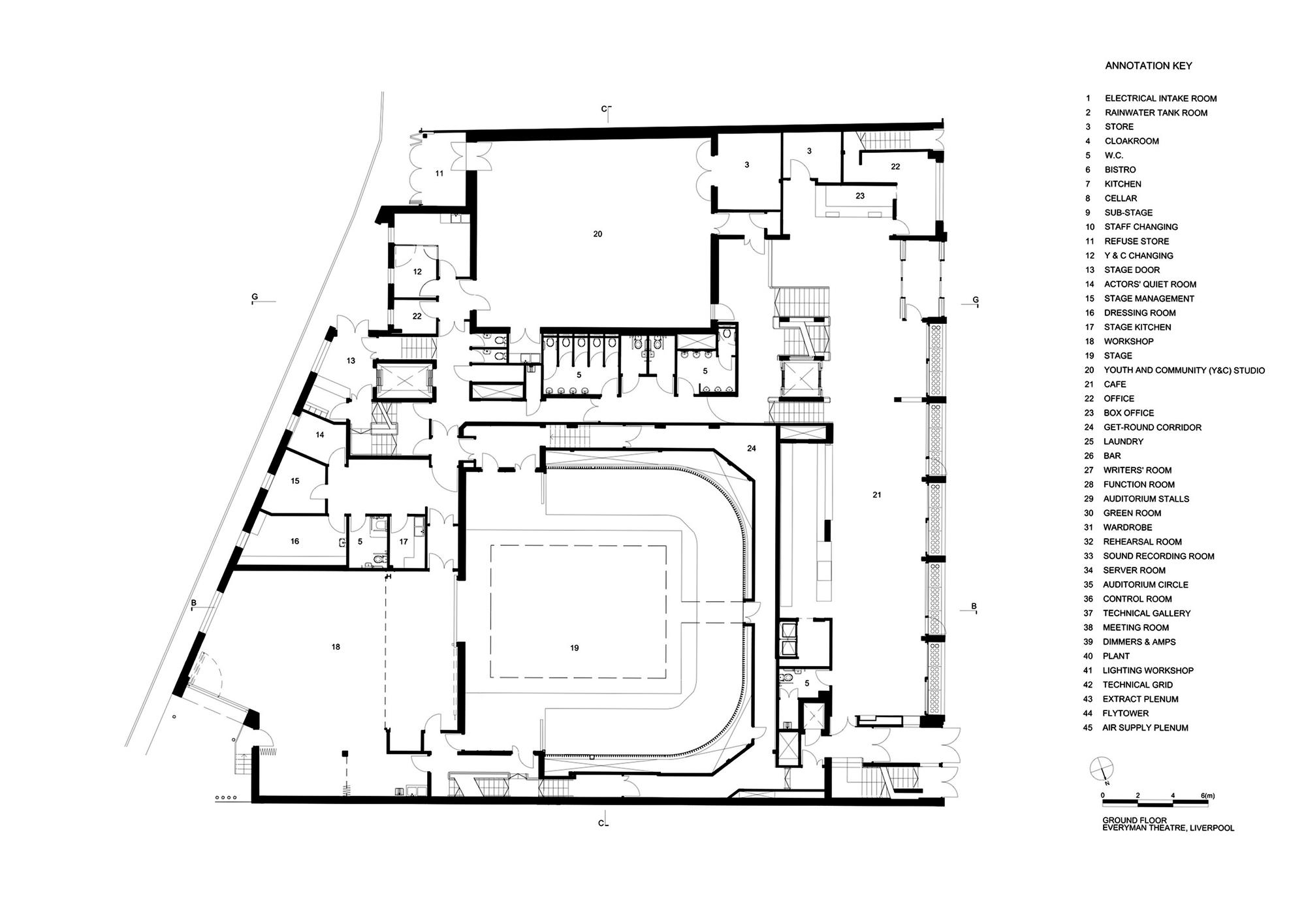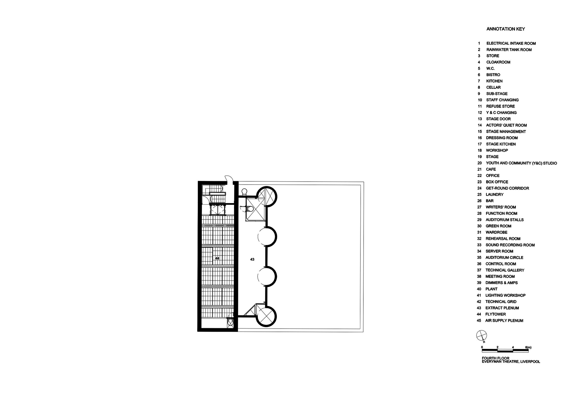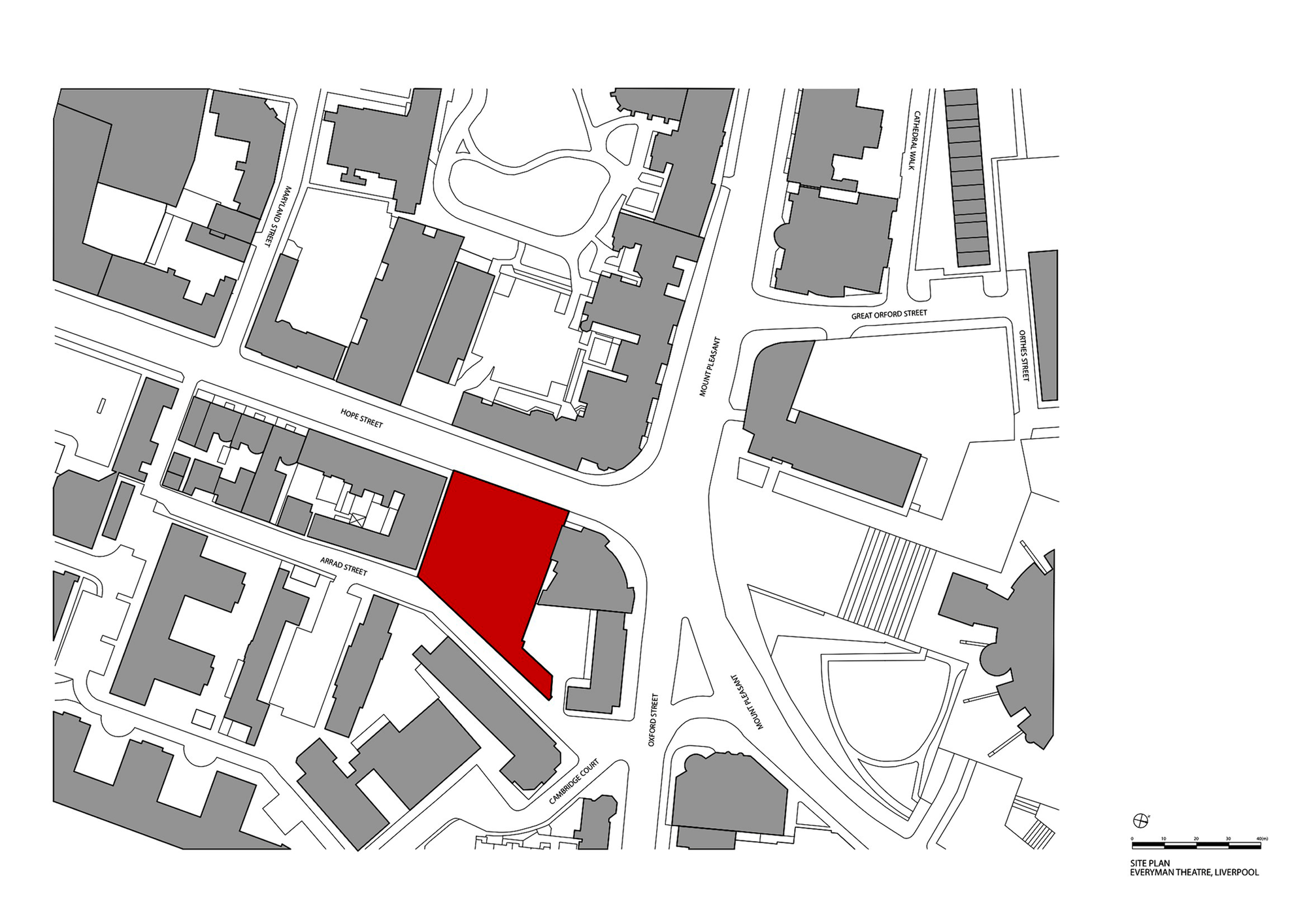 The Everyman is a new theatre to replace the 19th century home of an iconic Liverpool institution. The building makes use of the constrained topography of the site by arranging the public spaces around a series of half levels, establishing a continuous winding promenade from street to auditorium. Foyers and catering spaces are arranged on three levels including a new Bistro, culminating in a long piano nobile foyer overlooking the street. The auditorium is an adaptable thrust stage space of 400 seats, constructed from the reclaimed bricks of Hope Hall and manifesting itself as the internal walls of the foyers.