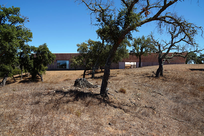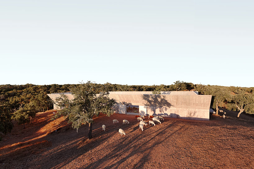10 kilometers off the atlantic coast in the alentejo region of portugal, the villa alem by swiss architect valerio olgiati sits amongst a vast forest of cork trees common to the area. The home is rather simple, if not very unique- it is characterized primarily by the reinforced concrete walls that define an inner courtyard, open yet entirely private. These outer partitions, once reaching a certain height, fold either into the space or away from it almost like the lids of a box in order to create shade or open views to the sky.