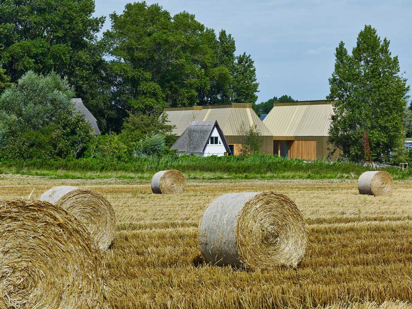 The materials used for the roof and facade surfaces were chosen for their similarity to natural reed. Over time, brass panels with variable canted ribbing will match the colour of the surrounding thatched houses through oxidation. Visitors enter the building from a forecourt; a central ground-floor foyer acts as a distributor and can be used as an event space. Views of the surrounding landscape are offered via precisely positioned openings.