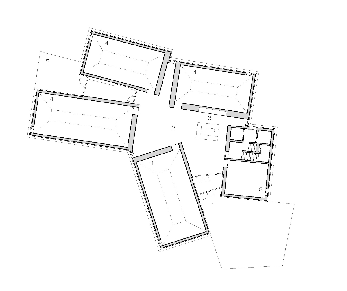 A second entrance marks a rest area that has a southern-facing terrace with views of the open countryside. With the exception of a small gallery, the exhibition rooms are designed as daylit rooms, with natural light entering via skylights arranged in the ridge area. A special prism system reflects direct light, allowing only diffuse zenith light to enter.