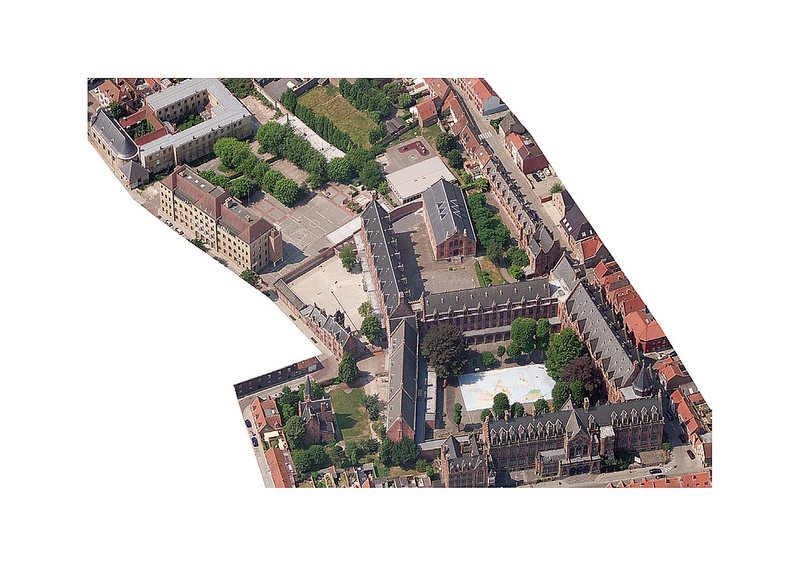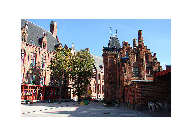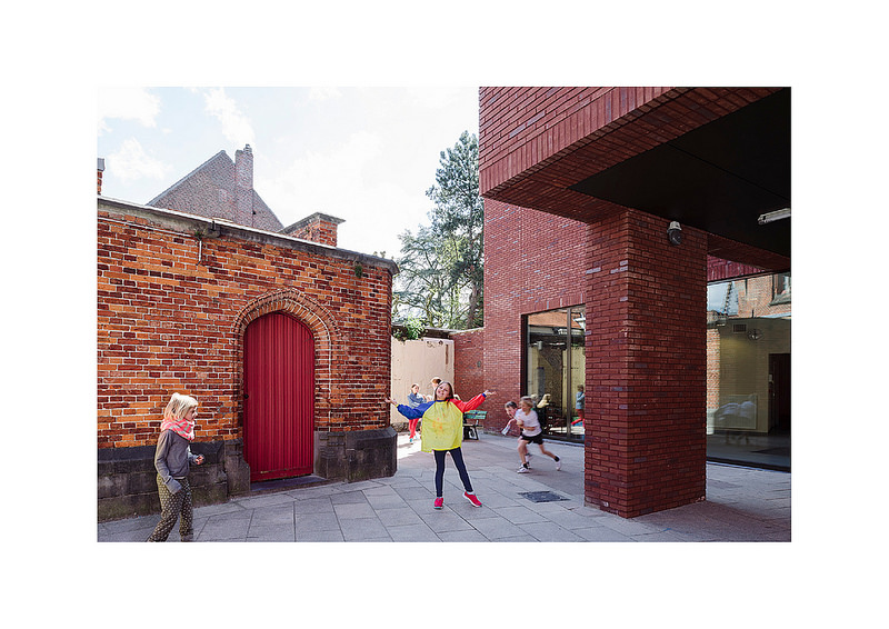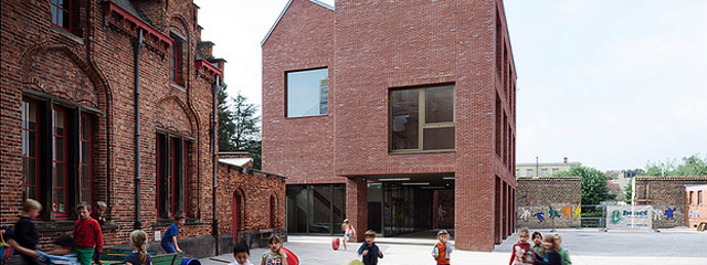 We aligneren de klasvleugel aan de straatzijde met de gevel van de Middenschool, zodanig dat de zichten vanaf de straat op de mooie kopgevels van het administratief gebouw behouden blijven. De inplanting van de klasvleugel aan speelplaatszijde houdt dan weer rekening met de hoge neogotische gevel. Zo ontstaat een spits driehoekig tussenvolume waarbinnen de circulatie zich bevindt.