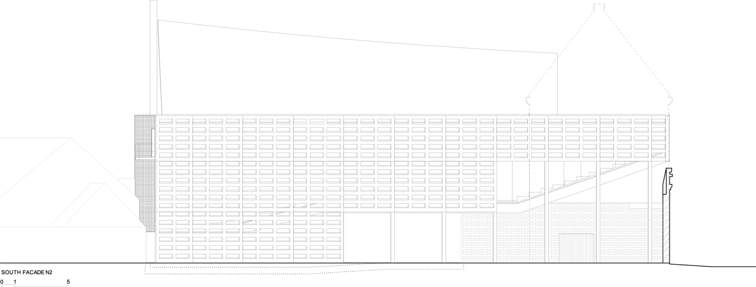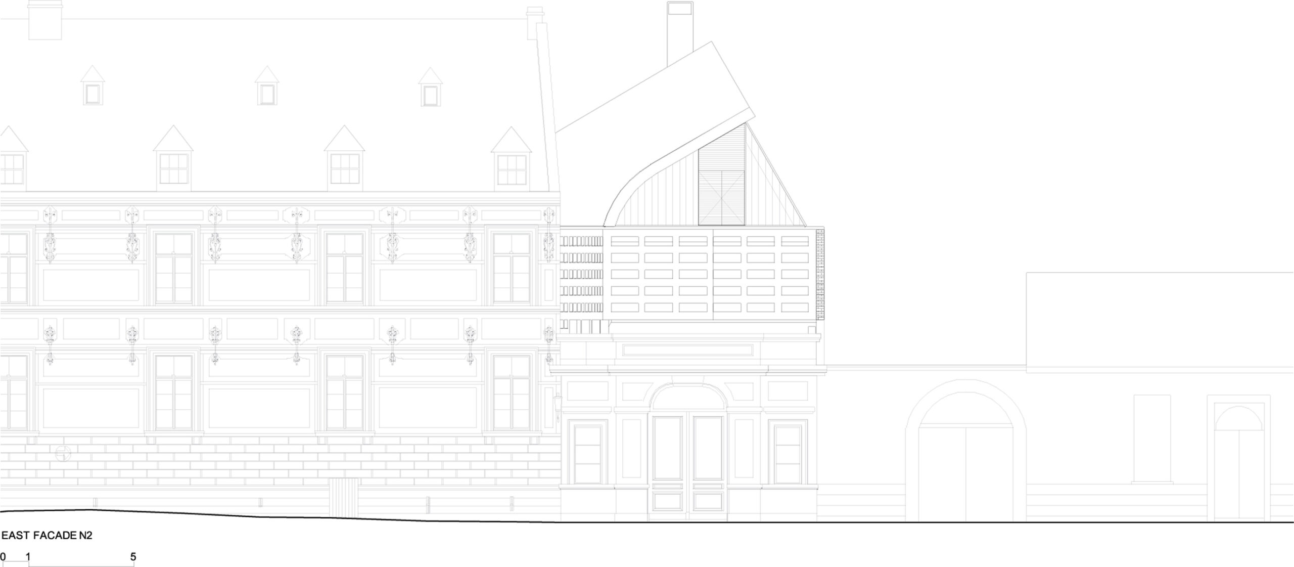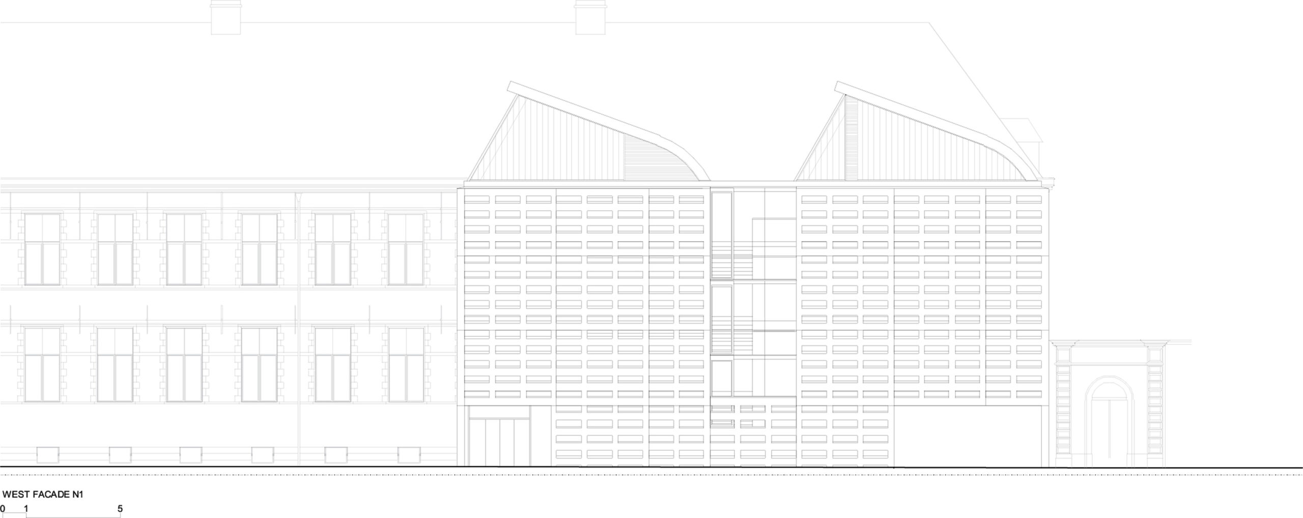 Two buildings are to be added to an old school campus, which will house a postgraduate law and economics school. The campus consists of a conglomerate of historical buildings organized around a sequence of enclosed courts. The campus is accessed from three different streets. The two new volumes replace less valuable old buildings. They are set freestanding from the old buildings while redefining the courts; their ground floor surface is partially open and continuous with the courts. N1 consists of classrooms end a central reception desk, N2 accommodates two lecture rooms, some offices and a foyer on ground floor. One side of the building covers an outside entrance space to the campus that is accessed from an existing gate on the main street.