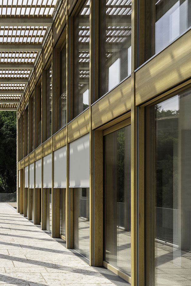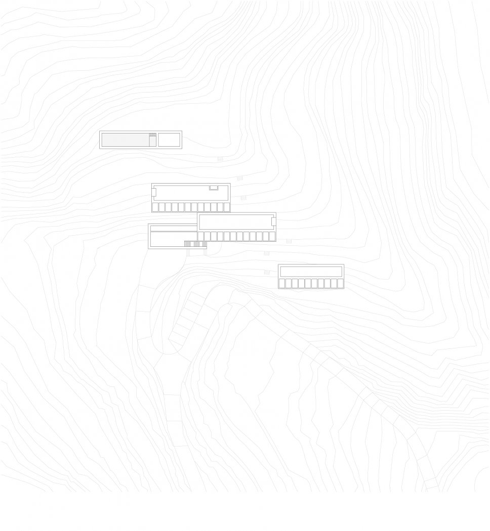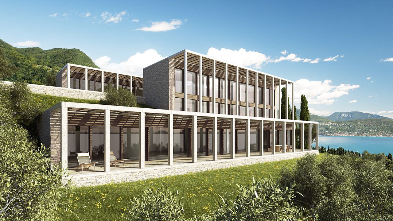 The typology of the villas interprets the architecture of the limonaias, which were built for the cultivation of lemons and are historically typical for the area. These buildings characterised the western bank of Lake Garda with their pergola-like structures up until the end of the 19th century. With reference to the limonaias, the building volumes are each framed by three solid exterior walls made of natural stone masonry and built up on a plinth of the same material. The main elevation facing the valley opens up towards the Mediterranean landscape with room-height windows. Pergolas with slim columns are placed in front of the volumes, echoing the rhythm of the surrounding olive groves. The pergolas provide protection from the sun and extend the interior into a protected outdoor space, which leads to further terraces with outdoor pools.
