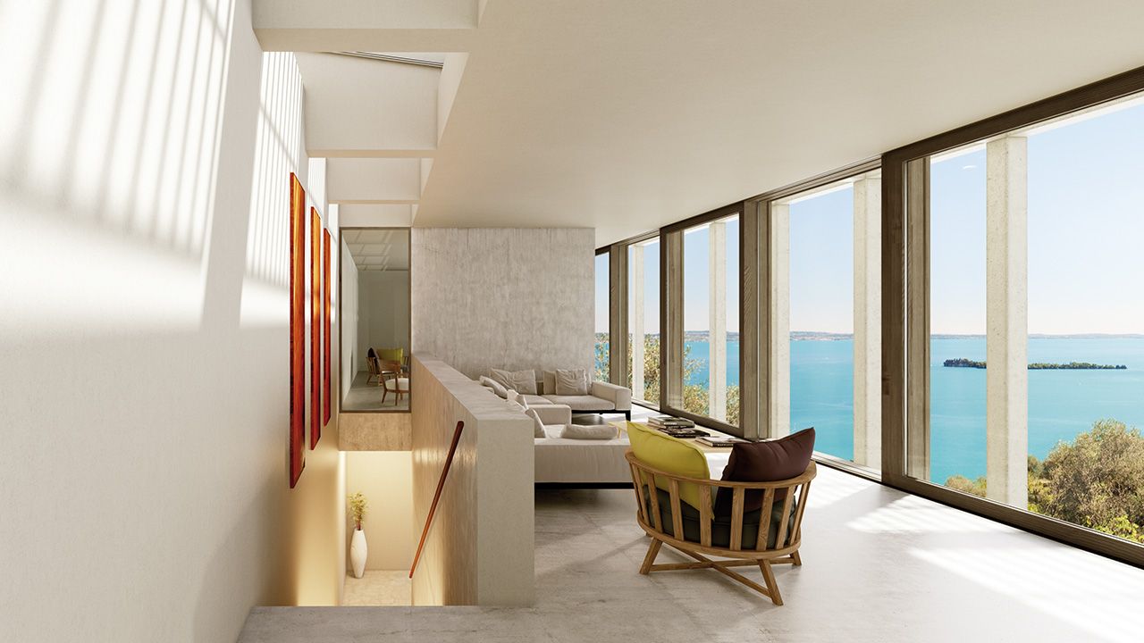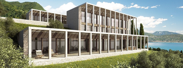 The west bank of Lake Garda is characterised by its mild climate and richly cultivated landscape. David Chipperfield Architects has built two villas on the hillside looking over the resort town of Gardone Riviera. Both buildings are carefully inserted into the landscape with its olive groves and cypress trees. Their volumes are divided into individual one or two storey structures, which are offset to one another following the topography of the hillside.