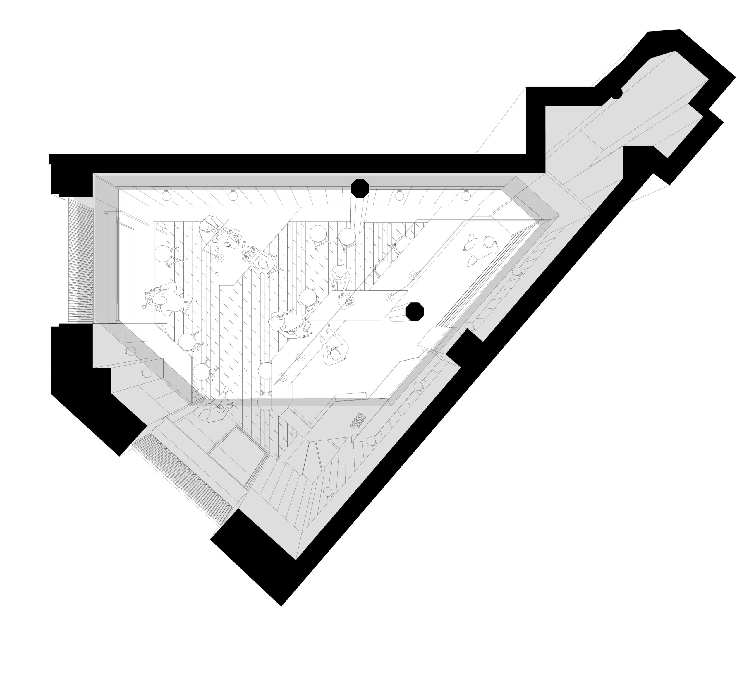 We understand the project as an opportunity to recover what we consider essential regarding what extant: the triangular geometry of the space, the generous original height of the establishment and its character. Regarding this last issue, the establishment worked during the 40’s as an “ambigú”, the former bar of theatre that is still placed at the other side of the square. Although the theater and bar are not linked anymore in functional terms, we propose to establish a link between both of them through the bar materiality. The intensification of the material memory is not a nostalgic or romantic attitude. We have chosen an unprejudiced and inclusive attitude, that doesn’t discriminate between this or that, but goes for this and that, our work, then, has consisted in updating the old layers (concrete octagonal columns) and putting them together (in “vis a vis” relation) with the new ones that echoes two fundamental issues; the old theatre by using the mirrors, the lights or the carpet ceiling and the old Barcelona sandwich bars by using marble.