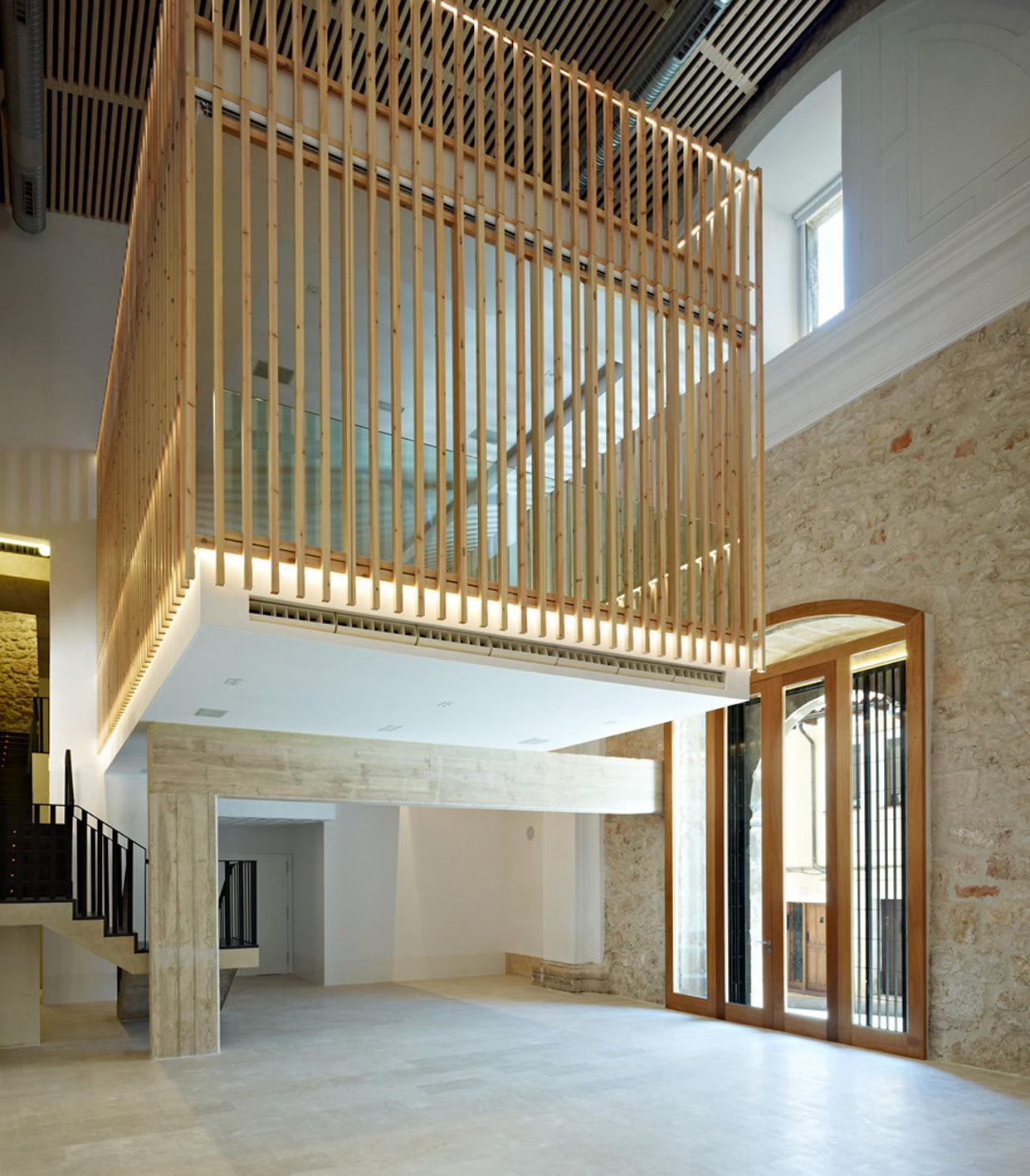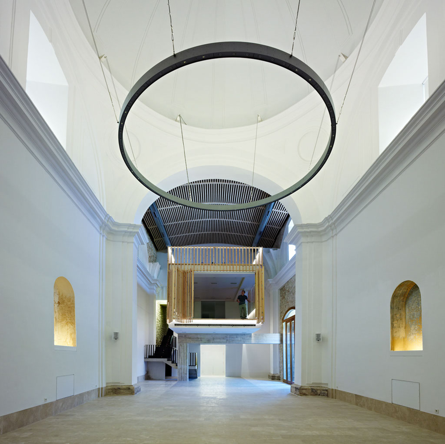 The materials used are the same as the original; beige marble main floor, white paint on the plaster moldings, pine slats on the ceiling and to enclose the modern choir that floats within the volume of the nave. The creation of new uses for historical spaces, and new employment possibilities in the context of rural Spain is an outstanding contribution to European culture. The innovation of the initiative has been recognized by the FADETA (Federación de Asociaciones para el Desarrollo Territorial del Tajo-Tajuña), a local program forming part of European Union FEADER (Fonds Européen Agricole pour le Développement Rural) program. The total construction cost is 852,000€, and is privately funded. Nevertheless the quality of the intervention and its novelty has been awarded a subsidy of 200,000€ by FADETA.