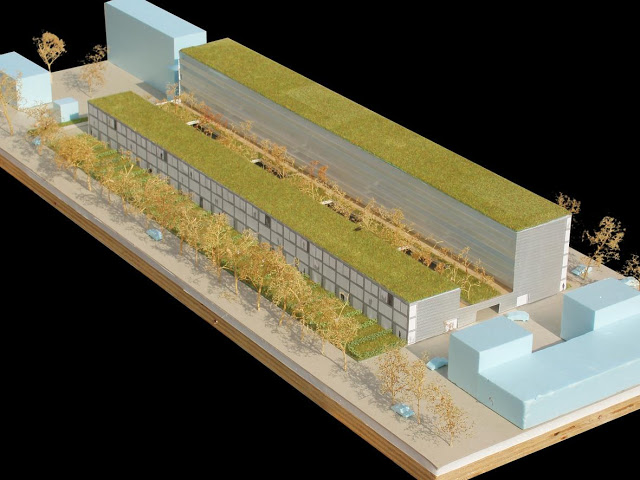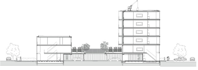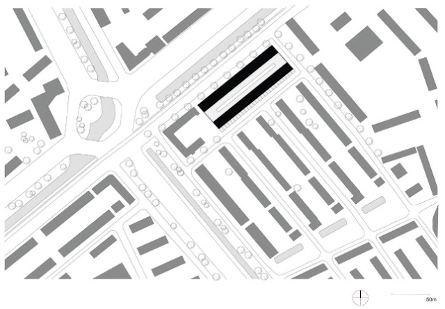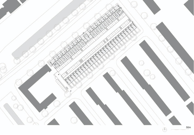 Lo que es distintivo aquí, en comparación con otros planeamientos similares, es el hecho de que no es posible cambiar la estructura de la calle debido a las nuevas infraestructuras, así como el hecho de que una operación a gran escala se debería realizar en pequeños pasos de 150 a 250 viviendas. Por esta razón, el nuevo desarrollo se fija sobre las mismas parcelas existentes, con una diferencia sustancial: la profundidad de los edificios ha sido incrementada de nueve metros a aproximadamente trece, y una nueva mezcla de apartamentos y viviendas con terraza más exclusivas. Los apartamentos se sitúan en el límite y forman una “frontera urbana”, mientras que las viviendas adosadas se encuentran al interior en una zona con mayor intimidad.