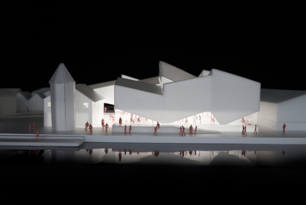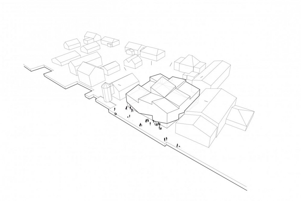 Teniendo en cuenta la estructura de los edificios cercanos, el nuevo edificio se compone de varios volúmenes más pequeños con tejados inclinados y agudos que se ensamblan en una unidad de construcción más grande. Una fachada de aluminio característica permite ver la forma de la composición de la construcción y ofrece una vívida impresión que refleja las luces y los colores del paisaje circundante.