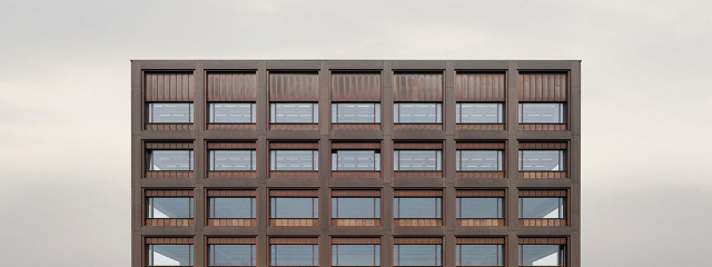 The structure of the building is based on a reinforced concrete frame. The façade is clad with large copper cassettes, reflecting this structure outwards. Smaller sheet copper elements clad the area around the windows. These smaller elements, which are manually pointed using a standing seam technique, display a degree of refinement and accentuate the surfaces within the overall structure. The rectangular columns along the narrow side of the building enhance the slender appearance, and the lively surface of the bronze cladding gives the façade an elegant, vibrant look.