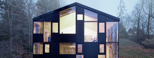 Hohlen house results from the conversion of a existing dwelling originally built in 1961. Designed by architect jochen specht, the expanded and renewed house is characterized by its clear gable-roof form and visually porous envelope, composed of large pains of glass which open the interiors to views of the austrian valley below. Located in the town of dornbirn, the singular gable-roof volume sits upon a concrete base that recedes into the sloping terrain.