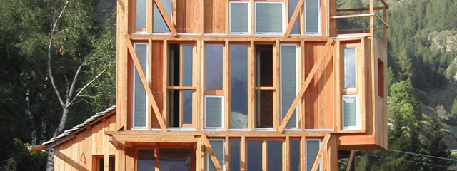 The project originates from the stunning view offered by the site and the particular generosity of its exposition to the sun. The house is situated at 1750 metres above sea level, in Valle d’Aosta, behind the small village of Vens, facing an arc of mountains stretching from Monte Emilius to the massif of Gran Paradiso and Grivola. The wooden frame which constitutes the weight-bearing structure is visible on the south façade – which all the internal rooms look onto – consisting in the main of windows and is open to the sun and the landscape, while it is completed with a wooden casing with robust isolation on the other sides.