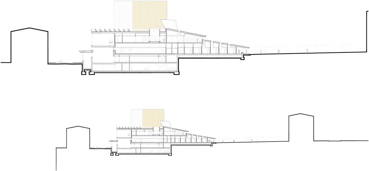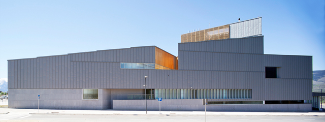 Este volumen de sección trapezoidal está caracterizado por la pendiente de una única cubierta que va de sur a norte, relacionando la gran cubierta inclinada con la plaza de enfrente, organizando un espacio único junto con las montañas del entorno.