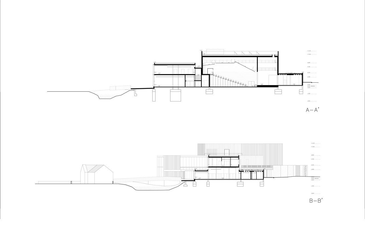 Inside, each part of the programme finds its natural place, almost respecting the hydraulic logic by which erosion and sediment define the edge of the bank of the stream. Thus, the inside is organised in longitudinal layers tracing the line of the stream and resulting in more or less dilated spaces, which have a progressive materiality more dynamic, fluid, clear and watery near the facade of the stream and more solid, opaque, private or stony in front of the mountain.
