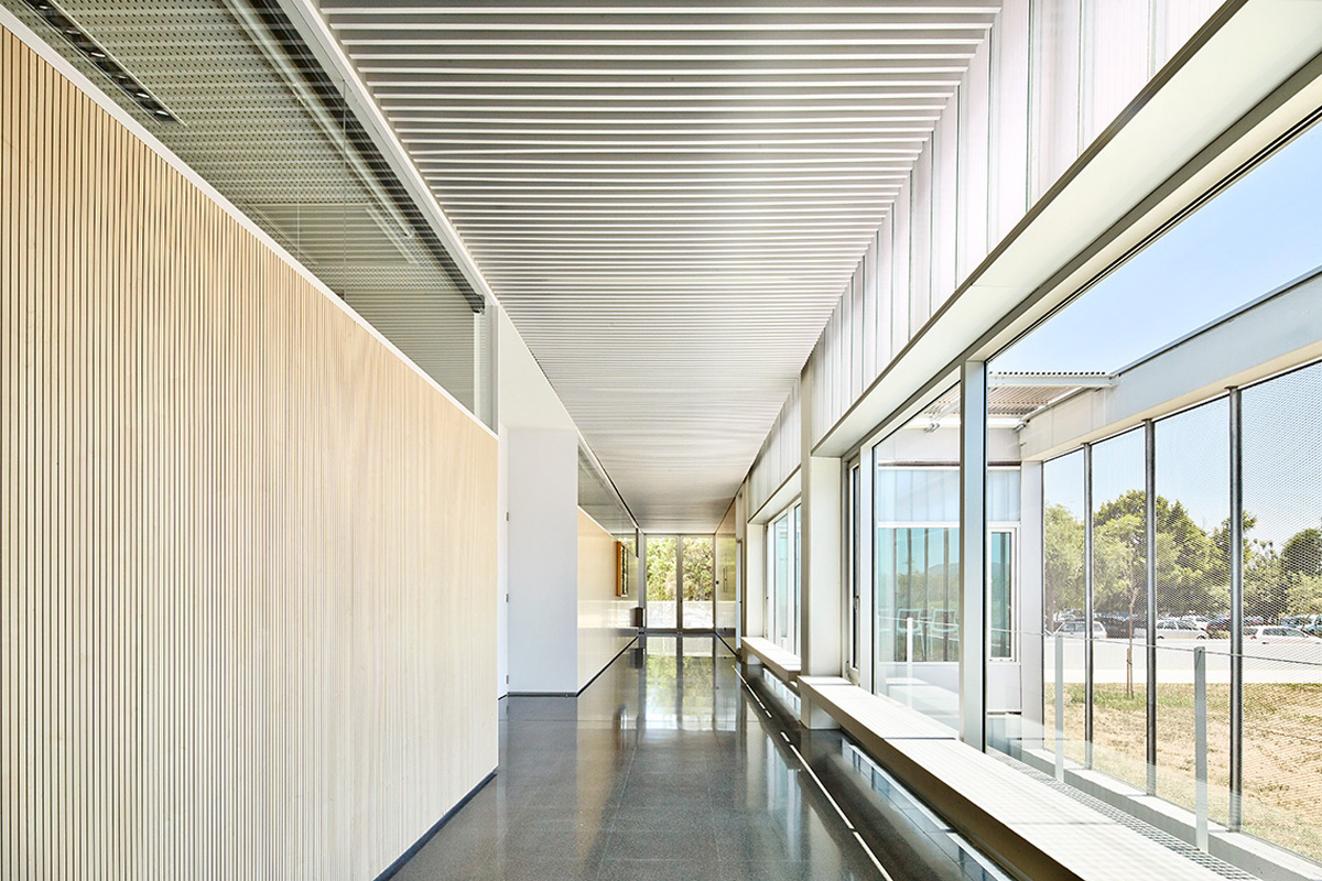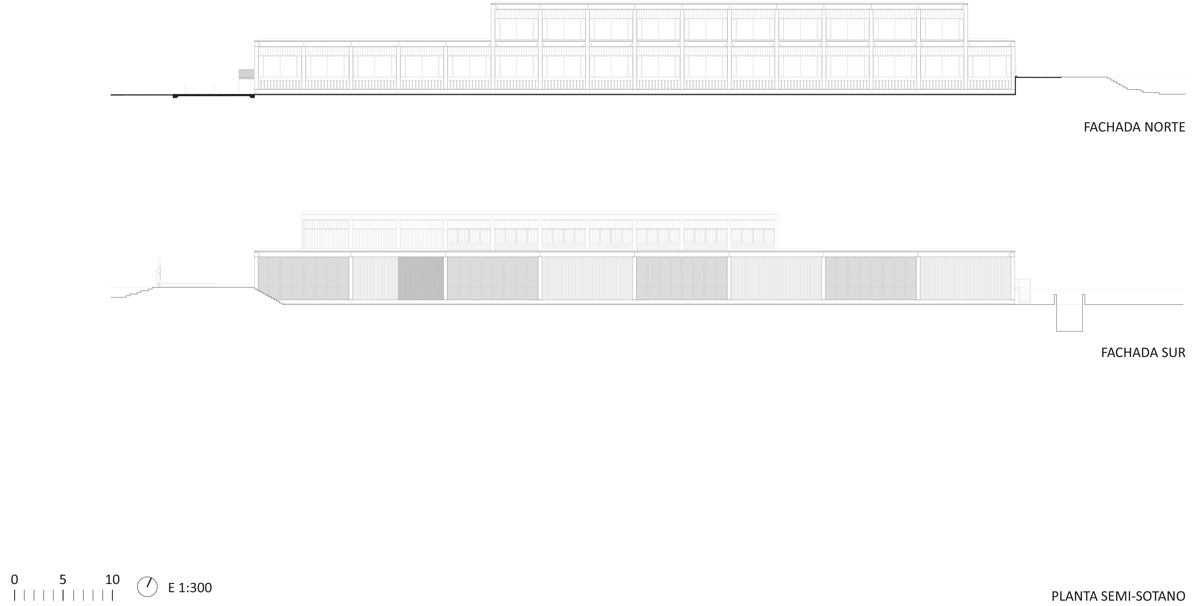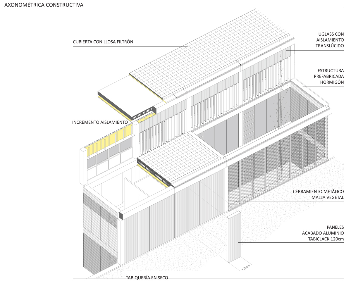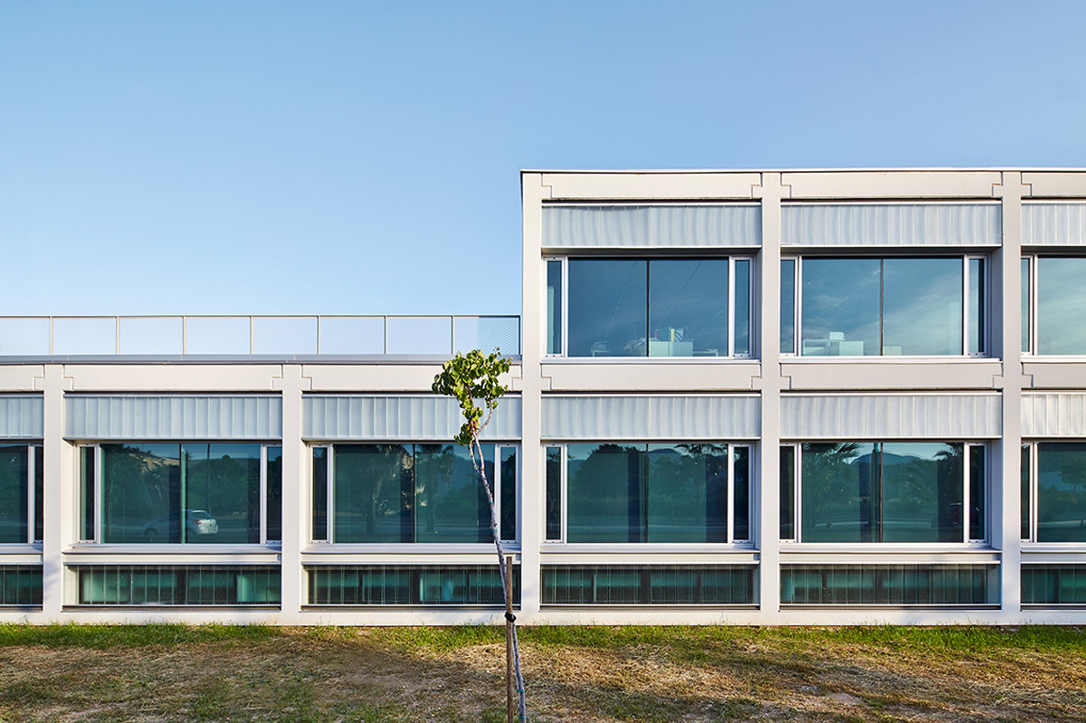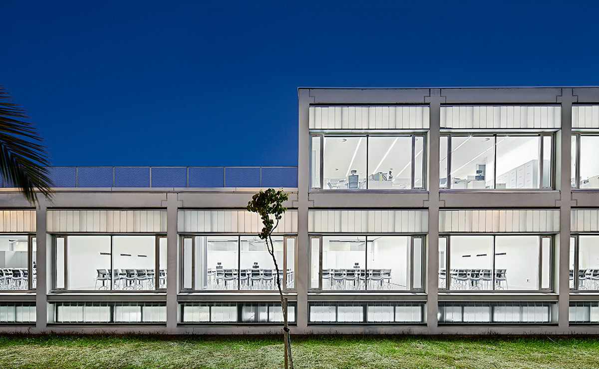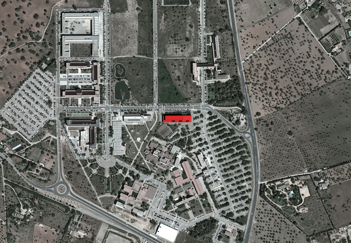 Un edificio ligero, compacto, flexible, eficiente y económico.Como punto de partida del proyecto, el reto consiste en pensar en una intervención amable de carácter mediterráneo, que ponga en valor el espacio exterior del entorno, con espacios calificados para diferentes actividades, y con una riqueza de relaciones en espacios fluidos, favoreciendo la movilidad y la mentalidad abierta de la educación que se imparte en un edificio para estudiantes universitarios.Hay una actitud de preocupación medioambiental desde los primeros planteamientos. Desde los caminos existentes, se produce un acceso natural al centro formando parte del recorrido habitual del Campus; pasear, descansar, entender desde el acceso al lugar y la edificación. Se trata de prolongar los caminos existentes y convertir los pasillos en paseos.Se plantea una volumetría compacta de dos plantas, en la traza que define el edificio vecino Beatriu de Pinós. La envolvente volumétrica se escalona a sur y en dirección al espacio libre, se minimiza por tanto su presencia visual.Se propone un edificio modular, con la adición del módulo mínimo que responde en el aula de 50 m2, que permite su agregación según las necesidades presentes y futuras de la UIB. La propuesta estructural permite tener la crujía de gran dimensión (14 m), correspondiente a las aulas, libre para modular en aulas pequeñas, medianas o grandes en función de las necesidades del Centro y de la UIB.Una serie de tres patios situados en la fachada sur y que llegan hasta la zona central de circulaciones, actúan de filtro solar y generan la relación con el entorno inmediato, al tiempo que equilibran la iluminación de las aulas -que reciben luz por sus dos lados- y permiten la ventilación cruzada de todos los espacios.