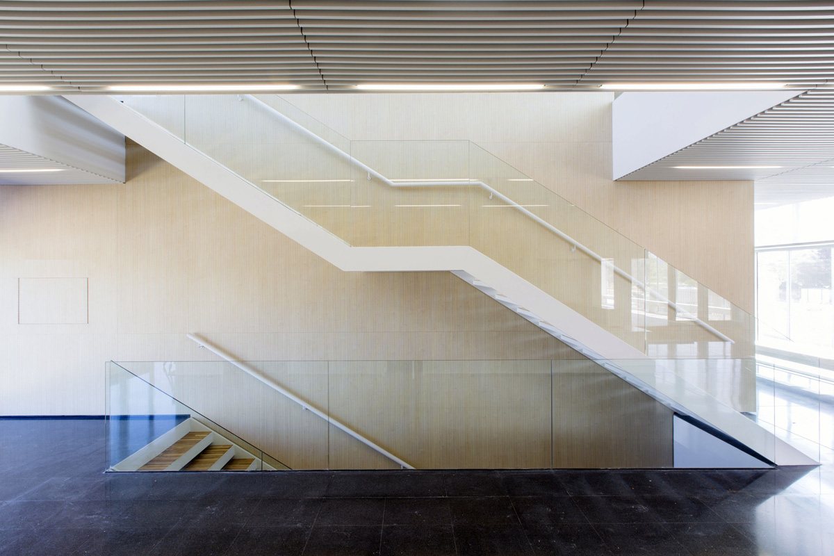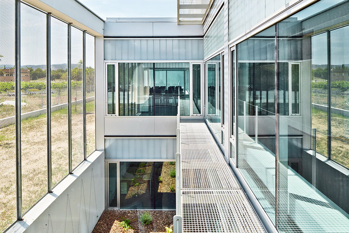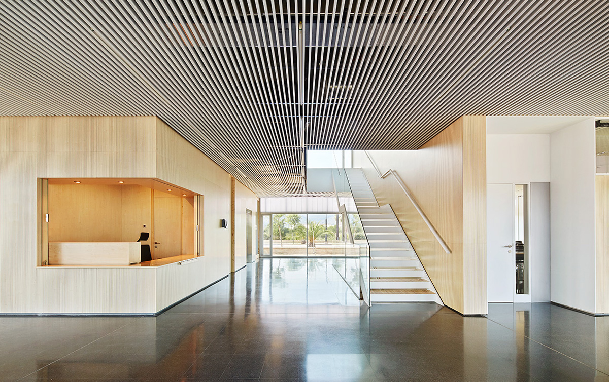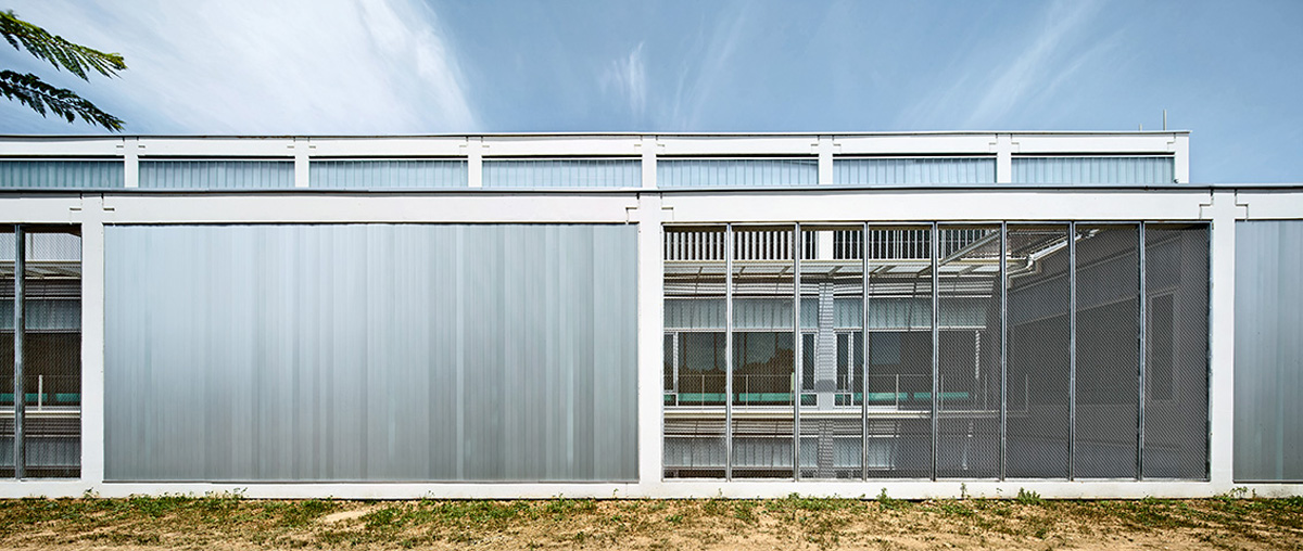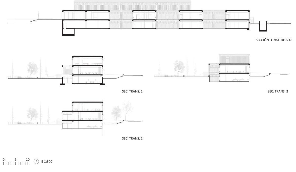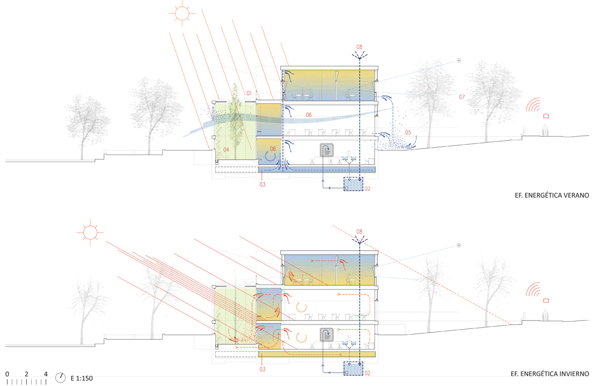 Un edificio ligero, compacto, flexible, eficiente y económico.Como punto de partida del proyecto, el reto consiste en pensar en una intervención amable de carácter mediterráneo, que ponga en valor el espacio exterior del entorno, con espacios calificados para diferentes actividades, y con una riqueza de relaciones en espacios fluidos, favoreciendo la movilidad y la mentalidad abierta de la educación que se imparte en un edificio para estudiantes universitarios.Hay una actitud de preocupación medioambiental desde los primeros planteamientos. Desde los caminos existentes, se produce un acceso natural al centro formando parte del recorrido habitual del Campus; pasear, descansar, entender desde el acceso al lugar y la edificación. Se trata de prolongar los caminos existentes y convertir los pasillos en paseos.Se plantea una volumetría compacta de dos plantas, en la traza que define el edificio vecino Beatriu de Pinós. La envolvente volumétrica se escalona a sur y en dirección al espacio libre, se minimiza por tanto su presencia visual.Se propone un edificio modular, con la adición del módulo mínimo que responde en el aula de 50 m2, que permite su agregación según las necesidades presentes y futuras de la UIB. La propuesta estructural permite tener la crujía de gran dimensión (14 m), correspondiente a las aulas, libre para modular en aulas pequeñas, medianas o grandes en función de las necesidades del Centro y de la UIB.Una serie de tres patios situados en la fachada sur y que llegan hasta la zona central de circulaciones, actúan de filtro solar y generan la relación con el entorno inmediato, al tiempo que equilibran la iluminación de las aulas -que reciben luz por sus dos lados- y permiten la ventilación cruzada de todos los espacios.