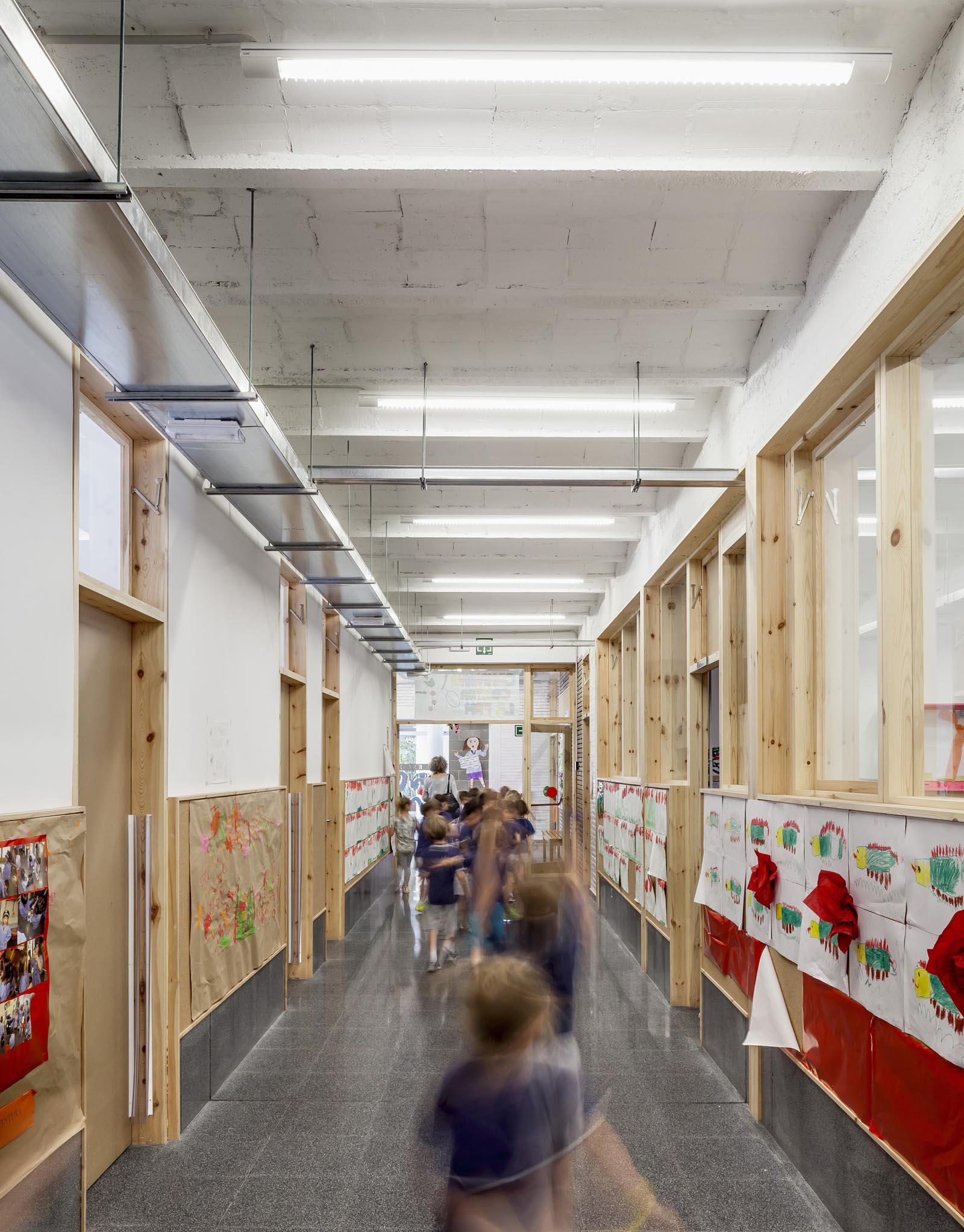 Por último, modificamos las circulaciones para acceder a la escuela, abriendo puertas o tapiándolas y construyendo un nuevo porche (más alto) contiguo al preexistente, que potencia y significa la entrada de la escuela y se convierte en un nuevo punto central común que actúa cómo rótula del centro, dando acceso a cubierto a los cuatro elementos principales que integran el complejo escolar: el edificio de enseñanza secundaria, el patio central, el polideportivo soterrado y el edificio de educación infantil y primaria.