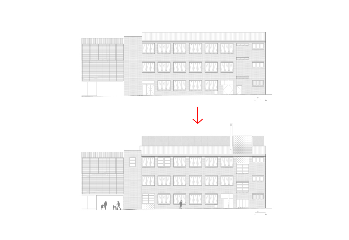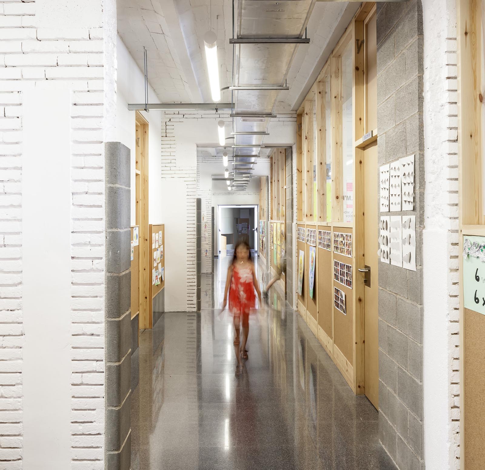 En la fachada de la calle, que aislamos térmicamente, la intervención es mínima pero imprescindible: mantenemos la obra vista y la composición existente que, junto con las vueltas cerámicas de los techos interiores, son casi el último vestigio explícito del edifico original; no tocamos las carpinterías blancas –ni originales ni bonitas, pero que están en suficiente buen estado- i, por requerimientos funcionales interiores, desplegamos varias acciones puntuales que plantean una relación de contraste con la preexistencia: seis nuevas ventanas de hojas basculantes que facilitan la ventilación cruzada con la fachada sur, y unos pocos elementos de bloque de hormigón visto (tapiados, casetón de la caja de escalera, etc.).