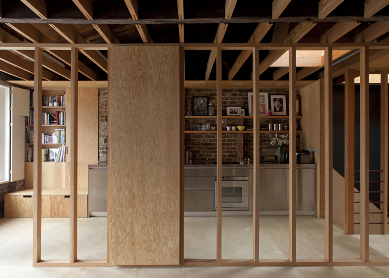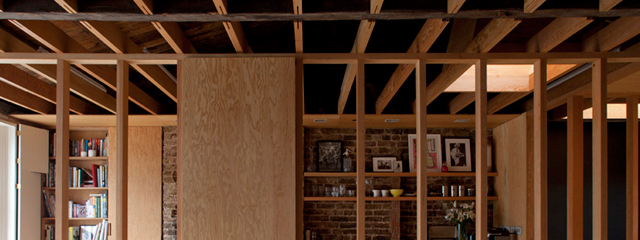 On the first floor a framework of timber studs is located where the original walls stood, creating an open, but layered kitchen and living space. The original roof structure is visible above this framework and new skylights with timber cowls bring in natural light.