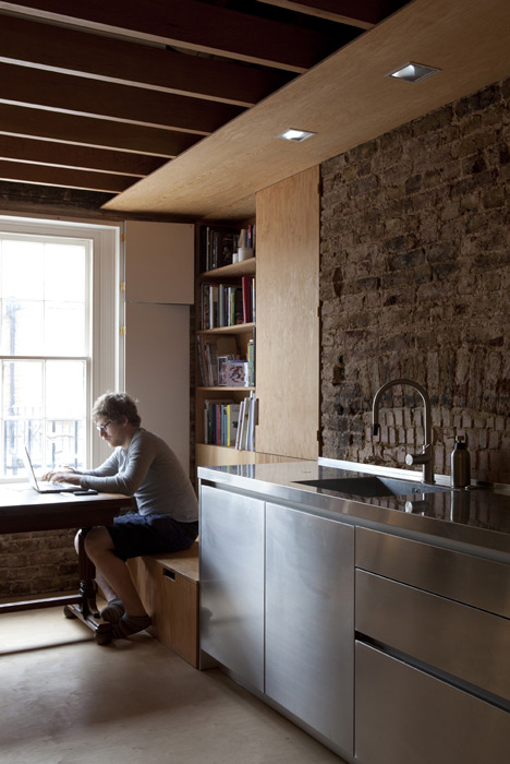 A crisp, stainless steel kitchen contrasts with the exposed brick walls and the study is lined in Douglas Fir panelling. Skilled craftsmanship elevates the modest palette of materials to create a characterful modern home.