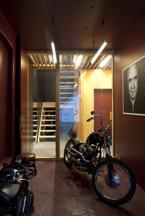 The reconstruction of a Grade II listed mews house in Holland Park, West London. Beyond the refurbished historic exterior an entry hallway with a red-pigmented concrete floor acts as both a workshop and display case for our client’s collection of vintage motorbikes, which can be seen from within the house through a large glazed partition.