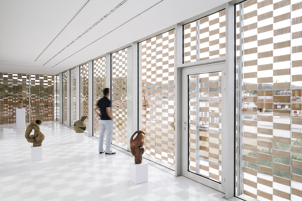 La fachada se conforma de una doble piel compuesta por un muro de vidrio y el tejido cerámico denominado FLEXBRICK. Así se crea un colchón térmico que dirige las miradas desde el interior, evita el calentamiento en las épocas estivales y conforma el dibujo de los secaderos de tabaco.