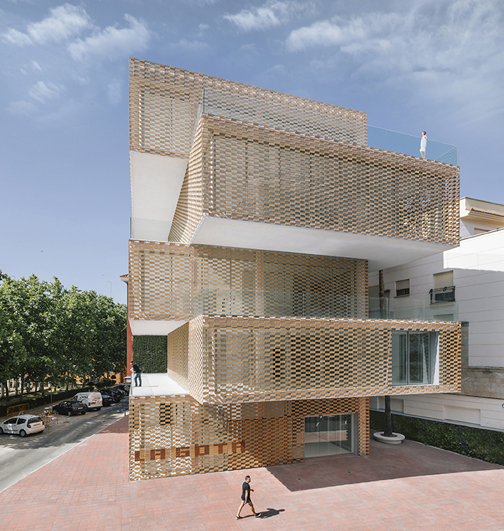La fachada es un sistema industrializado de láminas cerámicas flexibles que cubren todo el edificio haciendo diversos dibujos que producen luces y sombras en el interior. El sistema está compuesto por un trenzado de barras de acero en la que se insertan las piezas cerámicas en retícula, lo que permite flexibilidad, polivalencia y variabilidad.